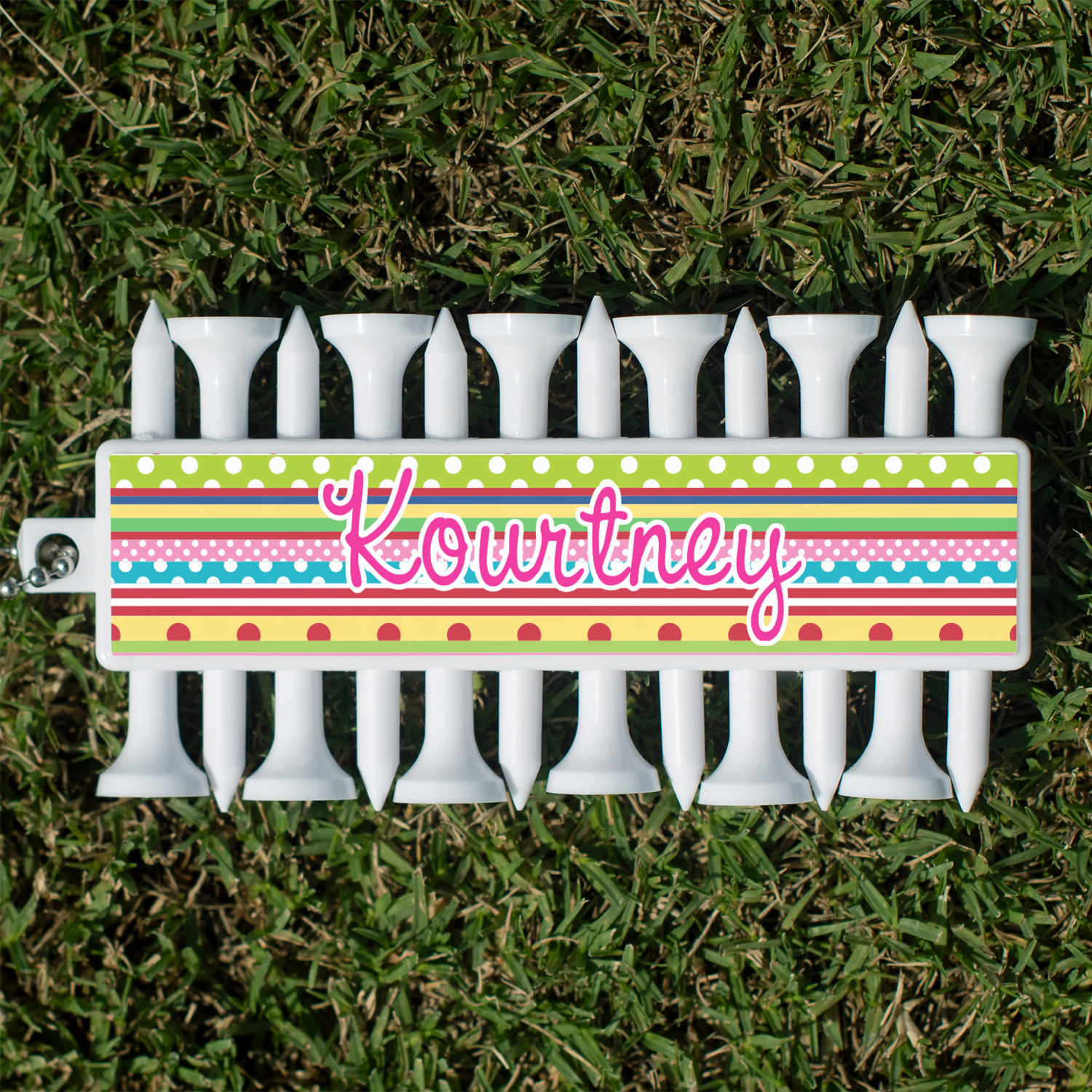 With 12 tees on a lightweight, portable key chain, it almost ensures a great 18 holes. Our tees are made of white plastic and are a little over 2". Design the front and the back of the golf tee holder. Pick from over a hundred designs, colors, and personalization styles! The set even comes with three removable ball markers as well!