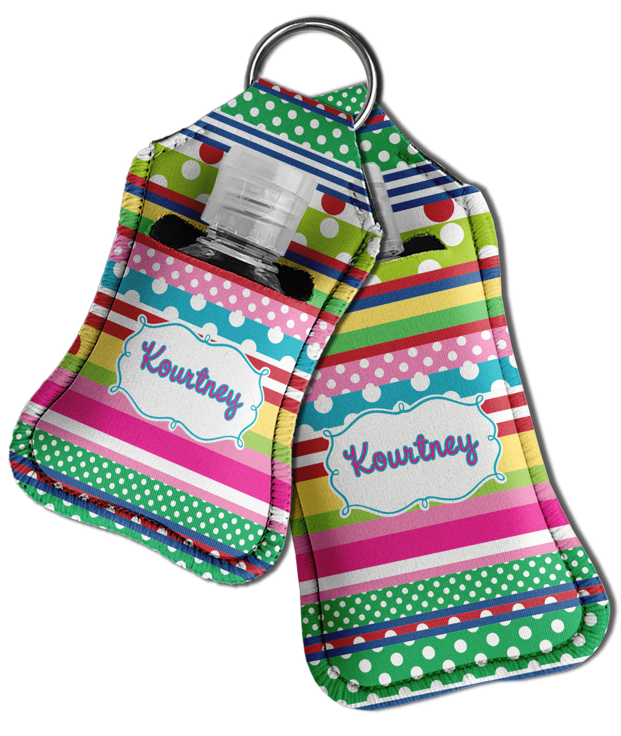 Each hand sanitizer holder comes with its own empty travel-sized, refillable hand sanitizer sure to fit snug in your customized sanitizer case! Our hand sanitizer cases are a durable, yet soft neoprene material sure to last any daily activities or travel agenda. Customize and personalize a hand sanitizer bottle holder with one of our two sizes - small (4.25" x 2.25") or large (5.5" x 2.5"). Each travel sanitizer holder comes with a keyring for attachment on bags, keys, or more!