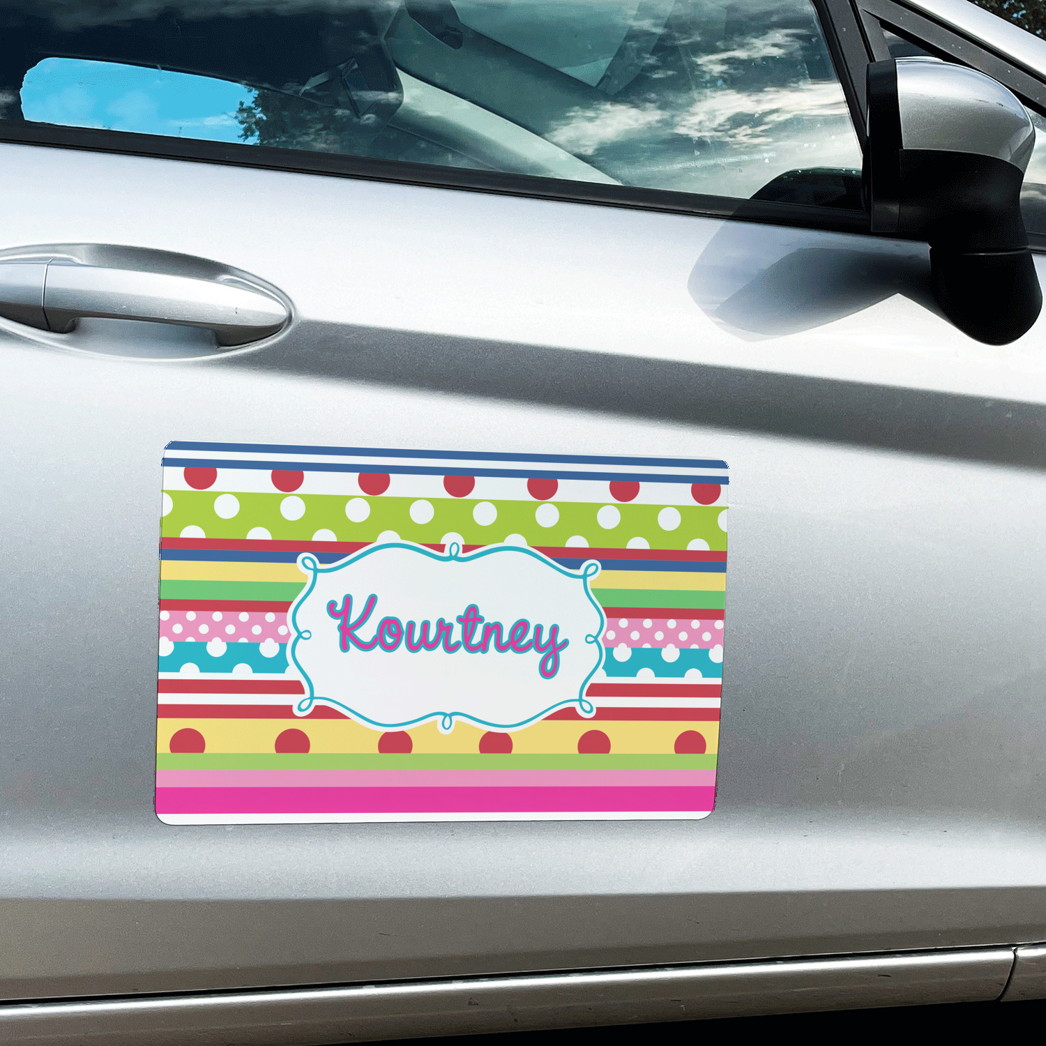 Your personalized large car magnet measures at 18 inches wide by 12 inches tall. They are 1 millimeter thick, which is considered, within the industry, as the ideal thickness for automobile magnets. The magnetic car decals will adhere to any smooth, ferrous metal surface of your cars body, such as the trunk door or a side panel.