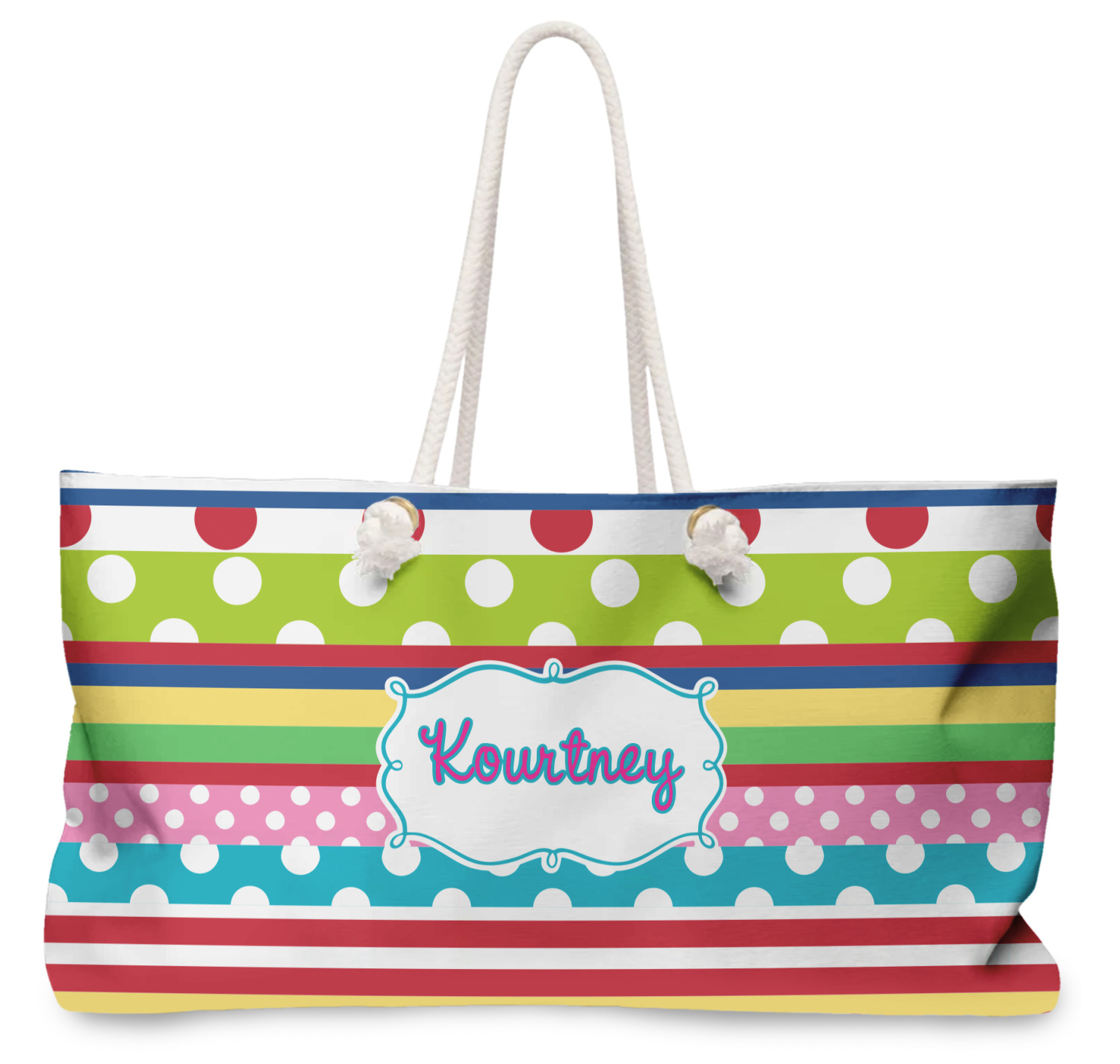 Our oversized weekender tote with rope handles is perfect for your weekend at the beach or on the town. This large tote are 24" W X 13" H, with a 5" gusset and a 27" thick rope handles with a knot that is put through a grommeted brass hole.
