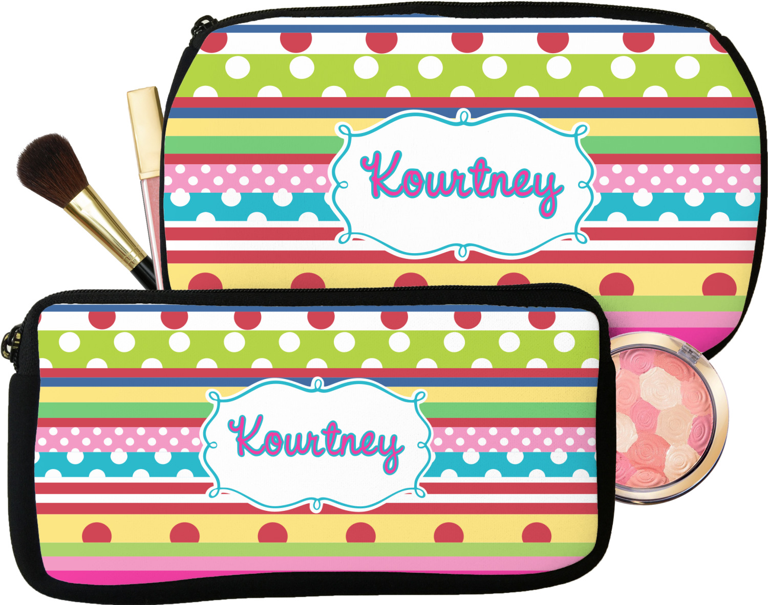 Our personalized makeup bags are available in many different designs, patterns and colors - so you are sure to find one that will love. They are made of neoprene (same material as wet-suits) and thus are water resistant, so spillages in your makeup bag will not end up all over you purse. They are customized on one side and are black on the other side and the zipper is black as well.