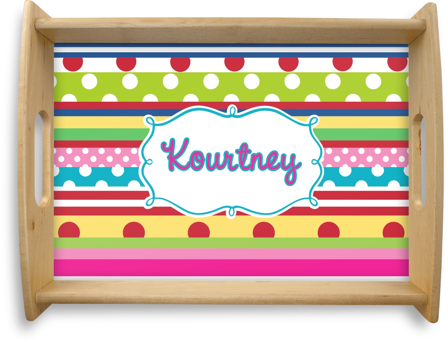 This serving tray with handles features square edges and two rounded sides, creating a very modern look. Each side is fabricated from a beautifully cut, natural wood. The bottom of the interior of the tray displays your customized design in bright, vibrant color. The tray is sold in both a black color and a natural wood look. Each variation of the wood serving tray has two sizes: Small, which is 14" x 10" x 2.25", and Large, which is 19.5" x 13.5" x 2.75".