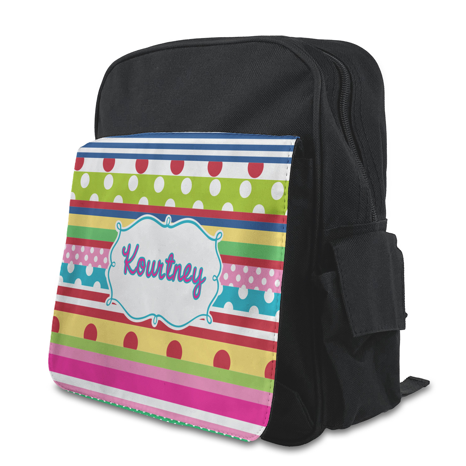 The backpack is a small size perfect for toddlers up to Kindergarten age. The zipper main pouch can hold most of their items and they have one side pocket with a flap to close it and the other side has a mesh pocket perfect for a water bottle. The outside has a customizable flap with a smaller pouch to hold more items. The straps are adjustable to fit your toddlers shoulders and they have a loop on top for hanging for storage.