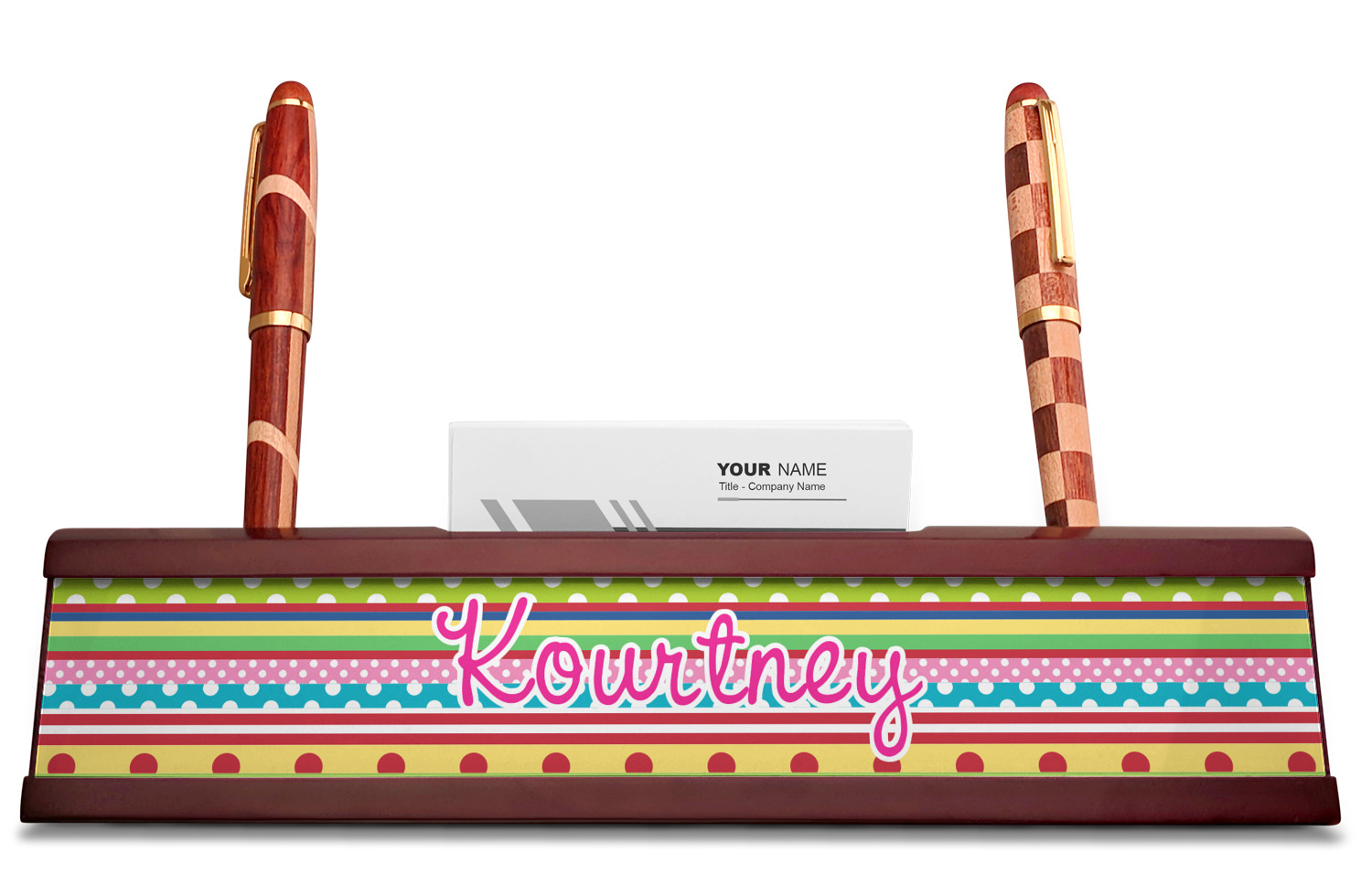 Your desk name plates are crafted from a high-quality, dark-cherry mahogany. At approximately 9.5 by 1.875 by 2.5 inches, this name plaque will fit perfectly, front and center, on your desk. Your customization spans across the entire face of the nameplate. Behind the nameplate lies a skinny slot that can fit approximately 15, traditionally-sized, business cards. You can also store your writing utensils on either side of this custom desk name plate.