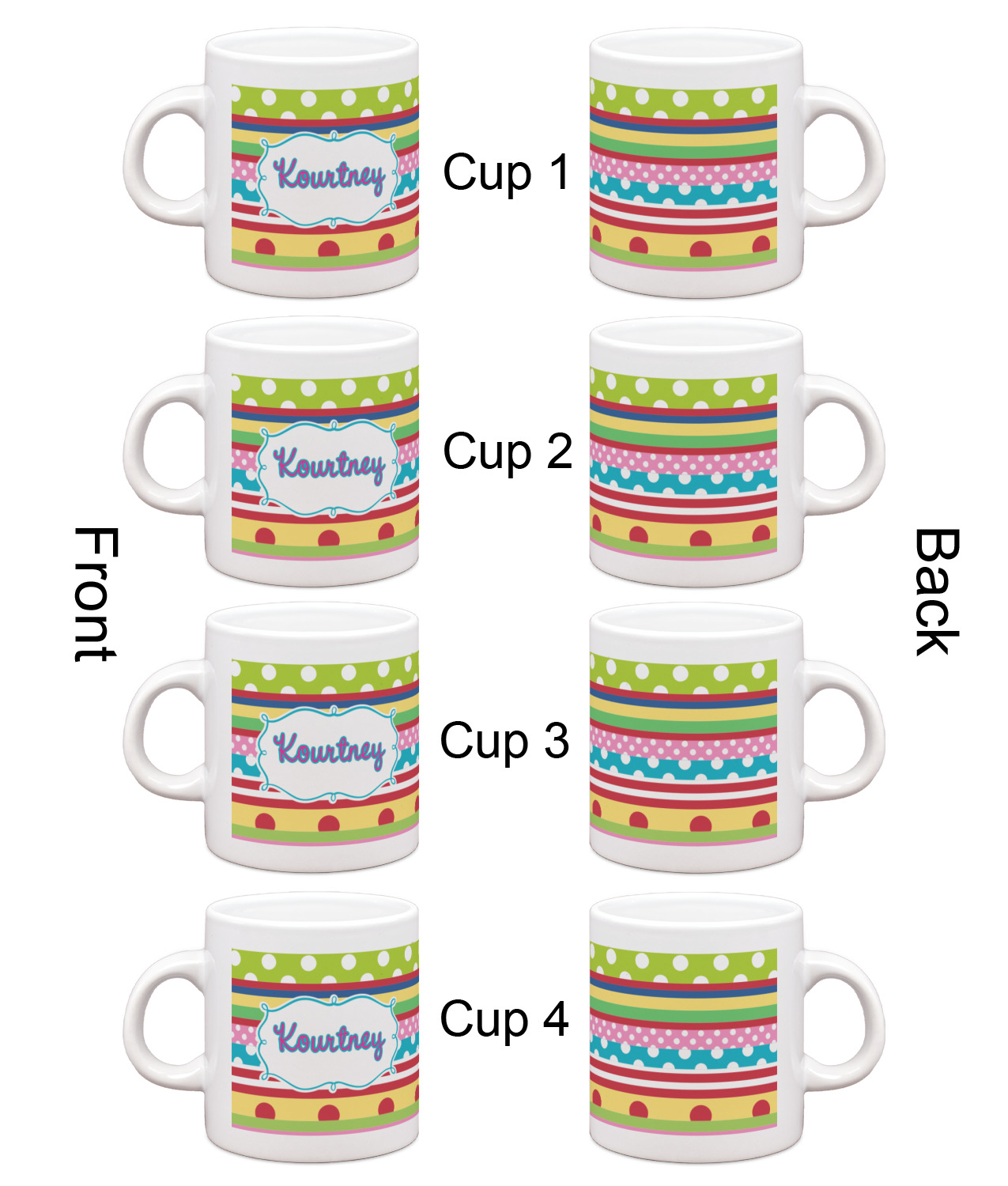 Each of our espresso mugs is a ceramic material sure to keep your drink warm. Personalize one cup for yourself, or order a set of 4! Its the perfect little gift for any coffee lover! We carry two sizes for you to personalize - 3 oz. (approx. 3.25" x 2.325" x 2.625") or 6 oz. (approx. 4" x 2.9" x 2.9"). Our 3 oz. mug is perfect for that single shot espresso while our 6 oz. mug can be your next favorite cappuccino cup holding two shots of espresso!