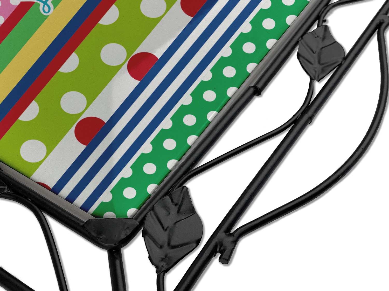 Our square trivets are made from a durable, wrought iron. This model features 4 small half circles, one on each corner, and a larger ring of iron that circles the central, customized tile. Each of the 4 corners has a round foot on its bottom for stability. This trivet is 8.75 by 8.75 inches, but the central tile measures at 6 inches on both sides.
