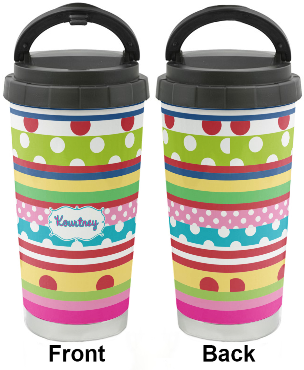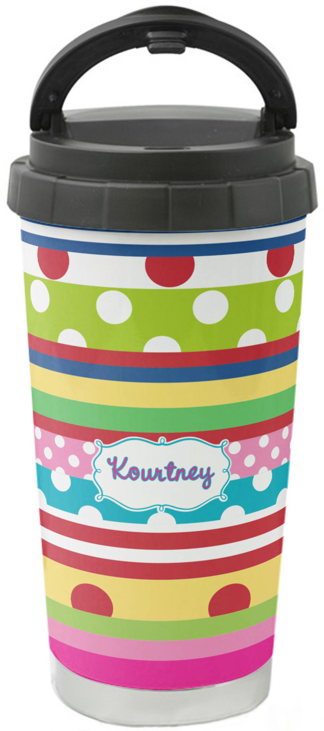 This sleek and tapered 16 oz stainless steel travel cup is a perfect fit in the hand. With the strip of visible stainless steel on the bottom, you'll be feeling classy!