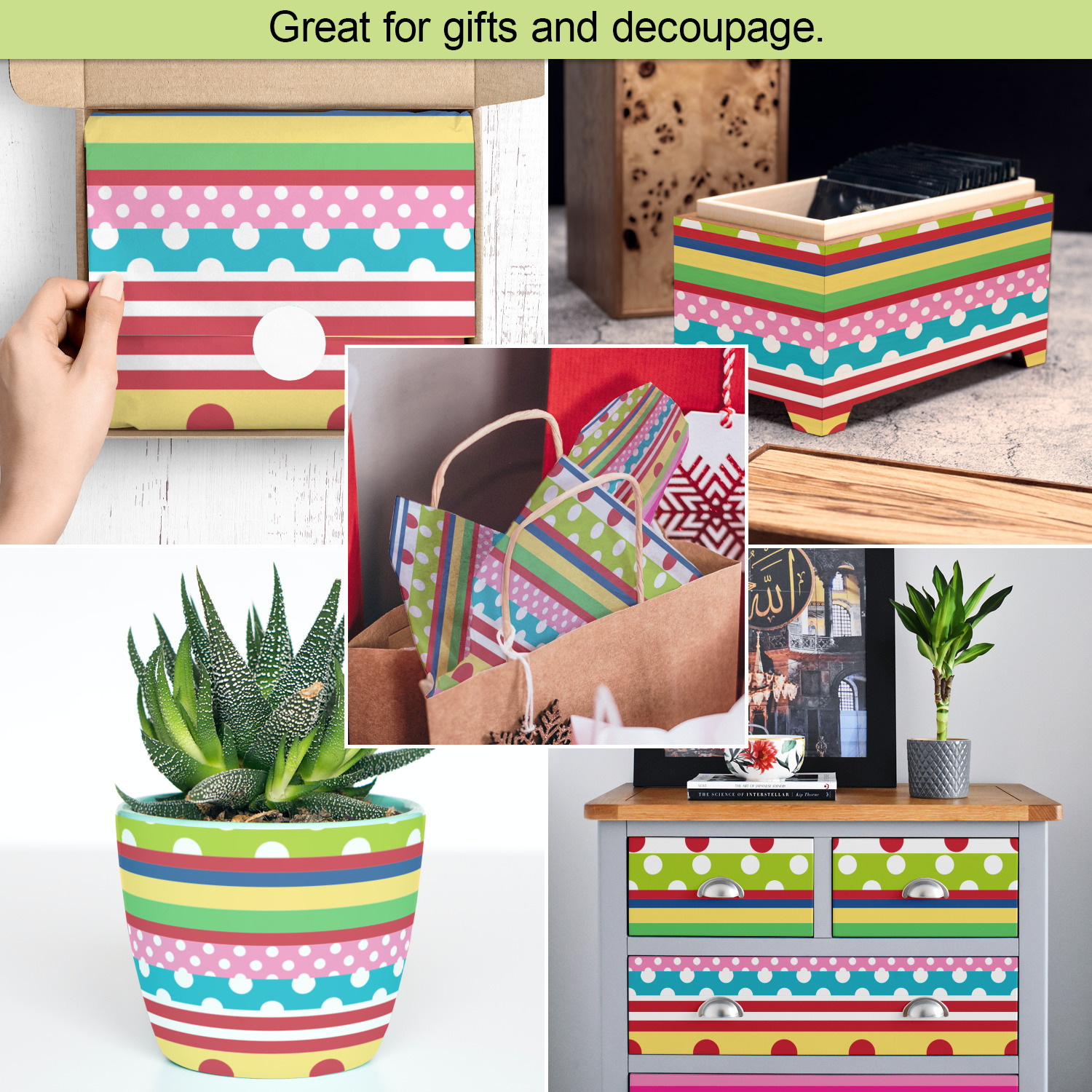 Our tissue paper sheets are also perfect for decoupage i.e. the art of gluing paper on ordinary objects to decorate them.