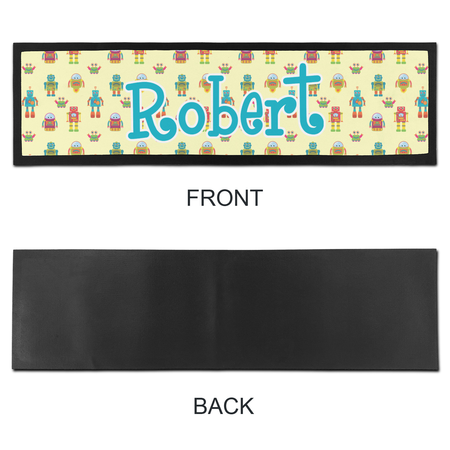 A bright blue band trimmed with a white stitch design add a pop of color. A white circle label trimmed in the same bright blue color allows for personalization of your choice.