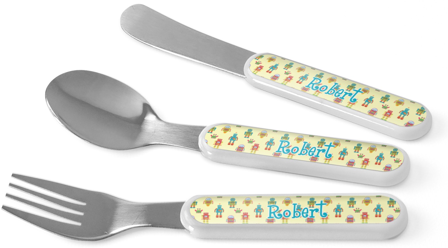 This set of kids' silverware includes a 5.5 inch spoon, fork, and knife, catered to your little one's needs. The prongs of this fork are flat and dull, while our spoon is small enough for tiny mouths, and the dullness of the knife itself resembles a butter knife, at most. These kids' utensils are made of stainless steel, while the handles are crafted from a durable plastic that will withstand the energy and use of your young one. We print your customization across the handles, making the cutlery set unique to your child only.