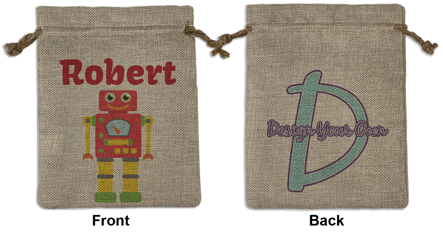 We sell our Burlap Gift Bags in 3 variant sized bags. Made with burlap polyester, each personalized bag can be secured with a twine drawstring pull. Your custom design is available to print on one side or both sides - completely up to you! The sizes of the bags measure approximately 4.5" x 6.5" for the smallest size, 6.5" x 8.0" for the medium size, and 6.5" x 13.5" for the large-sized bag.