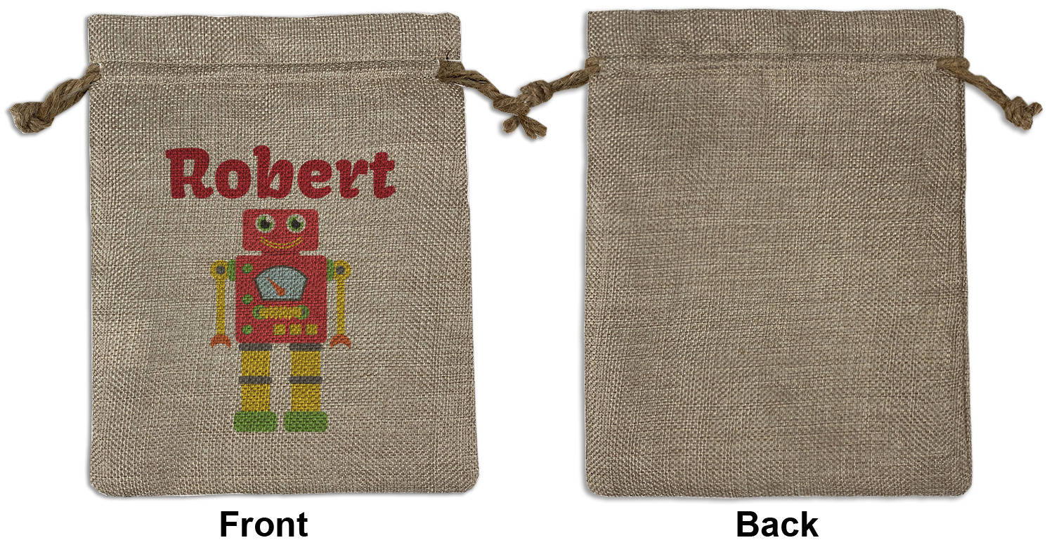 We sell our Burlap Gift Bags in 3 variant sized bags. Made with burlap polyester, each personalized bag can be secured with a twine drawstring pull. Your custom design is available to print on one side or both sides - completely up to you! The sizes of the bags measure approximately 4.5" x 6.5" for the smallest size, 6.5" x 8.0" for the medium size, and 6.5" x 13.5" for the large-sized bag.