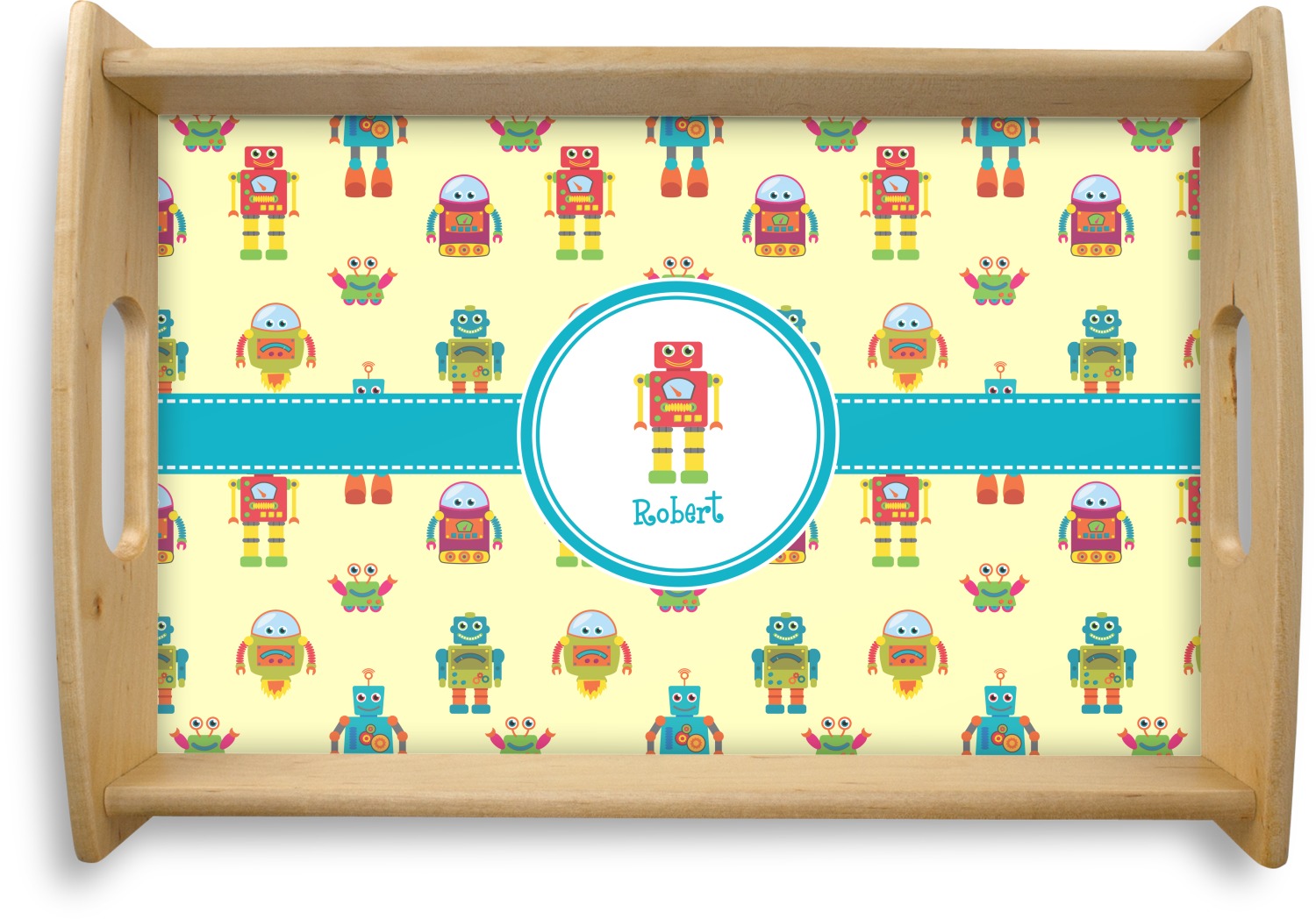 This serving tray with handles features square edges and two rounded sides, creating a very modern look. Each side is fabricated from a beautifully cut, natural wood. The bottom of the interior of the tray displays your customized design in bright, vibrant color. The tray is sold in both a black color and a natural wood look. Each variation of the wood serving tray has two sizes: Small, which is 14" x 10" x 2.25", and Large, which is 19.5" x 13.5" x 2.75".