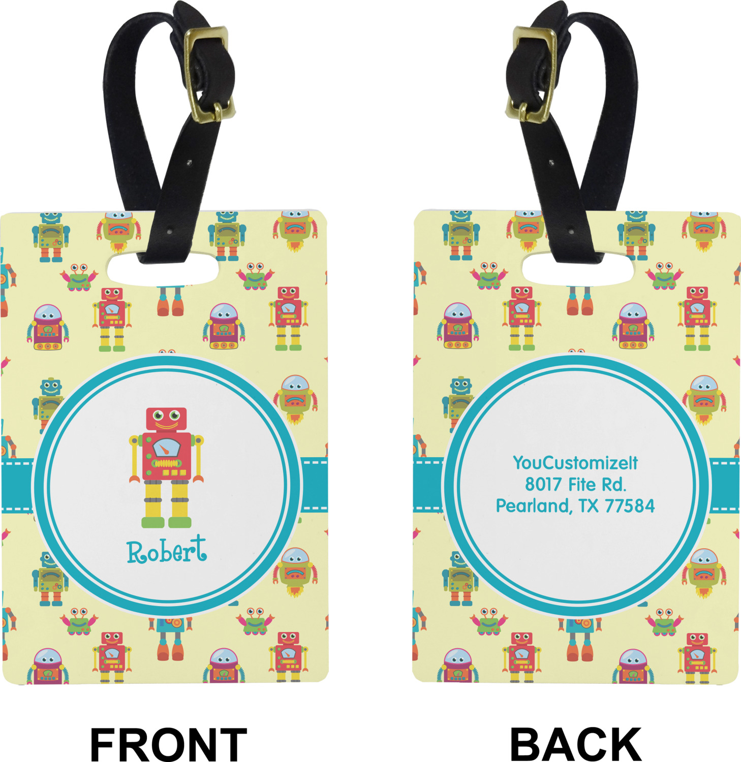 These cute luggage tags are made of a fiber-reinforced, UV-resistant plastic, making them waterproof and durable enough for both everyday use and the rugged adventures of any traveler! A leather strap with holes and a buckle is included with your purchase and can be used to attach your custom luggage tag to any suitcase, backpack, or duffel bag. You can design these travel tags as you wish; your customization will be displayed across the front, while the back will show as little or as much personal information as you want.