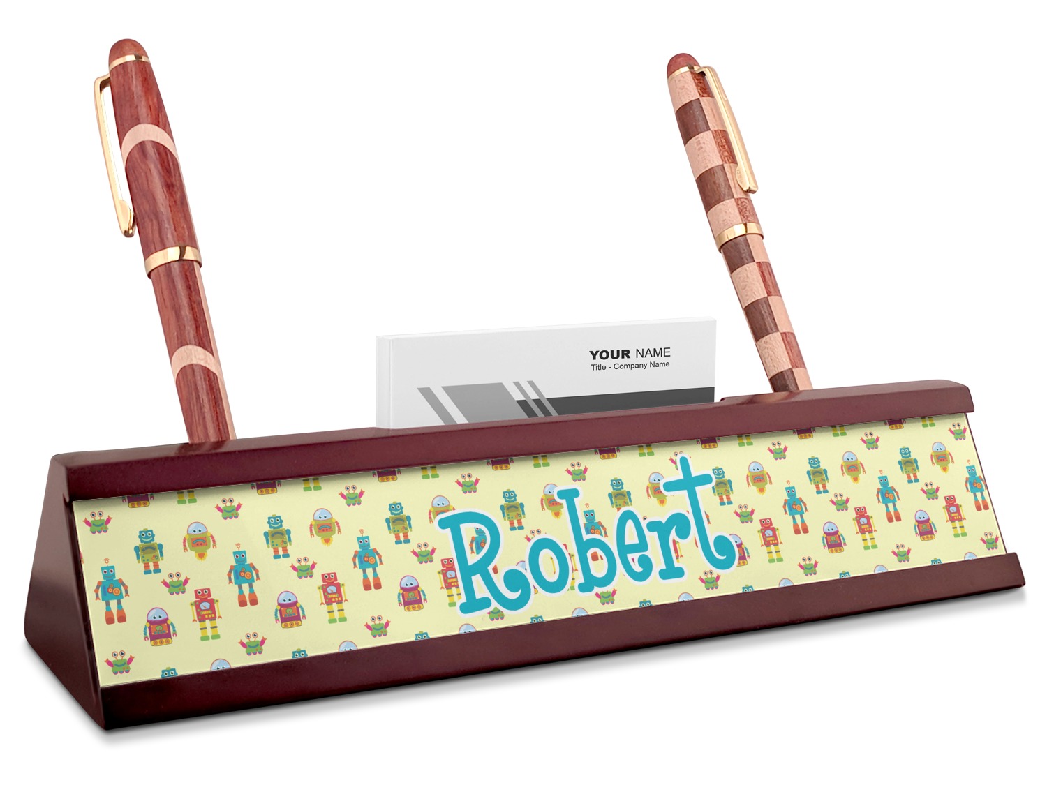 Your desk name plates are crafted from a high-quality, dark-cherry mahogany. At approximately 9.5 by 1.875 by 2.5 inches, this name plaque will fit perfectly, front and center, on your desk. Your customization spans across the entire face of the nameplate. Behind the nameplate lies a skinny slot that can fit approximately 15, traditionally-sized, business cards. You can also store your writing utensils on either side of this custom desk name plate.