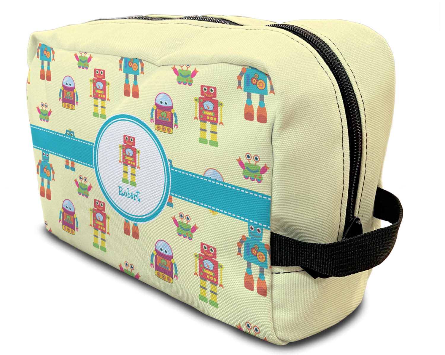 Our toiletry bag has the traditional dopp kit design i.e. a side to side zippered closure, giving you easy access to all the contents inside and a sturdy handle on one side of the bag. The canvas fabric for dopp kits is printed, then cut and sewn here in the USA.