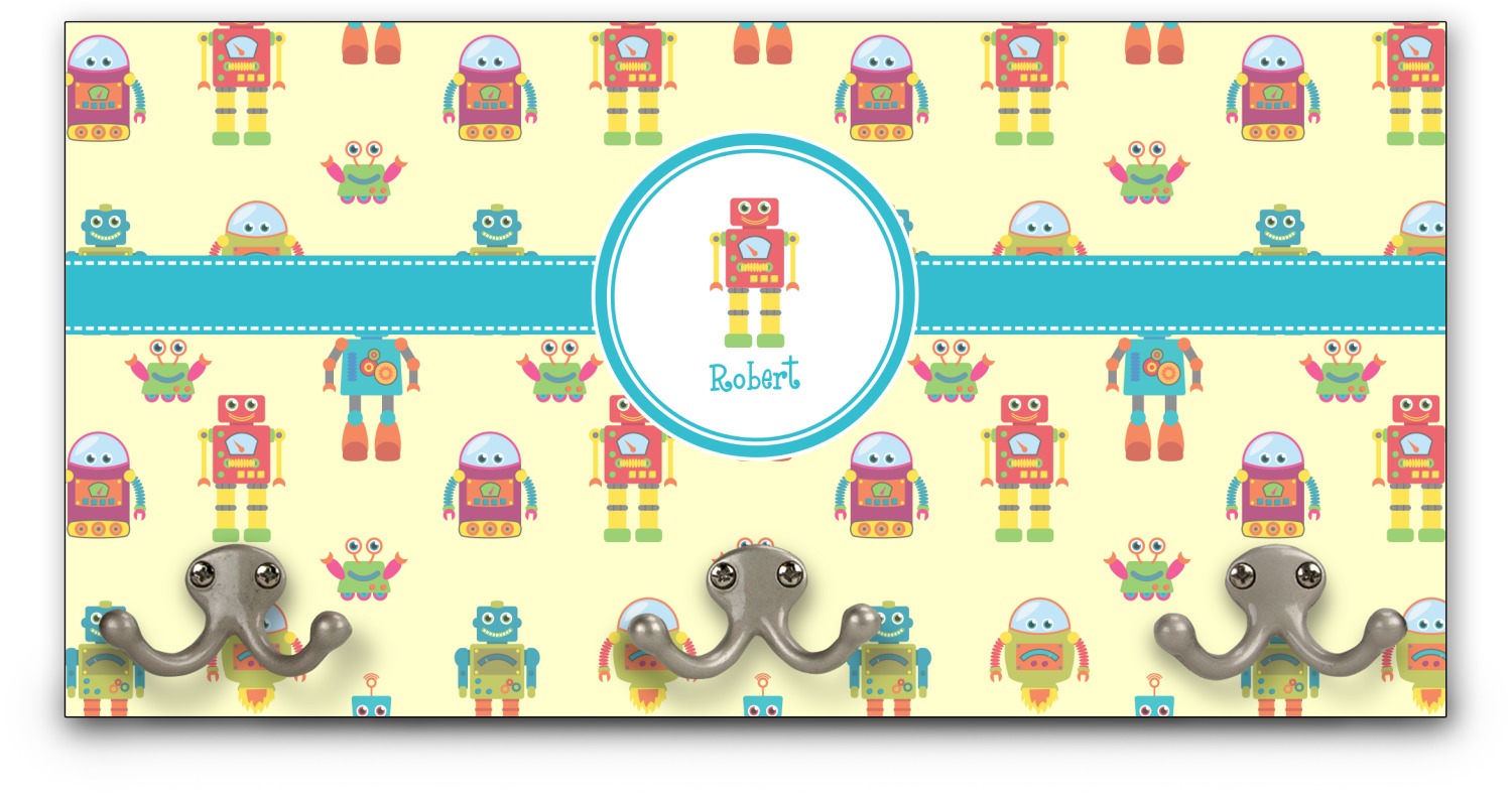 This coat rack is the perfect way to add some personality to your wall or entryway. The board is made of a strong maple that is approximately 16" x 8". The three 2-prong hooks are a sturdy metal that have three screws attaching them to the board. Your design is printed right onto the front of the board while the back and sides are a simple black.