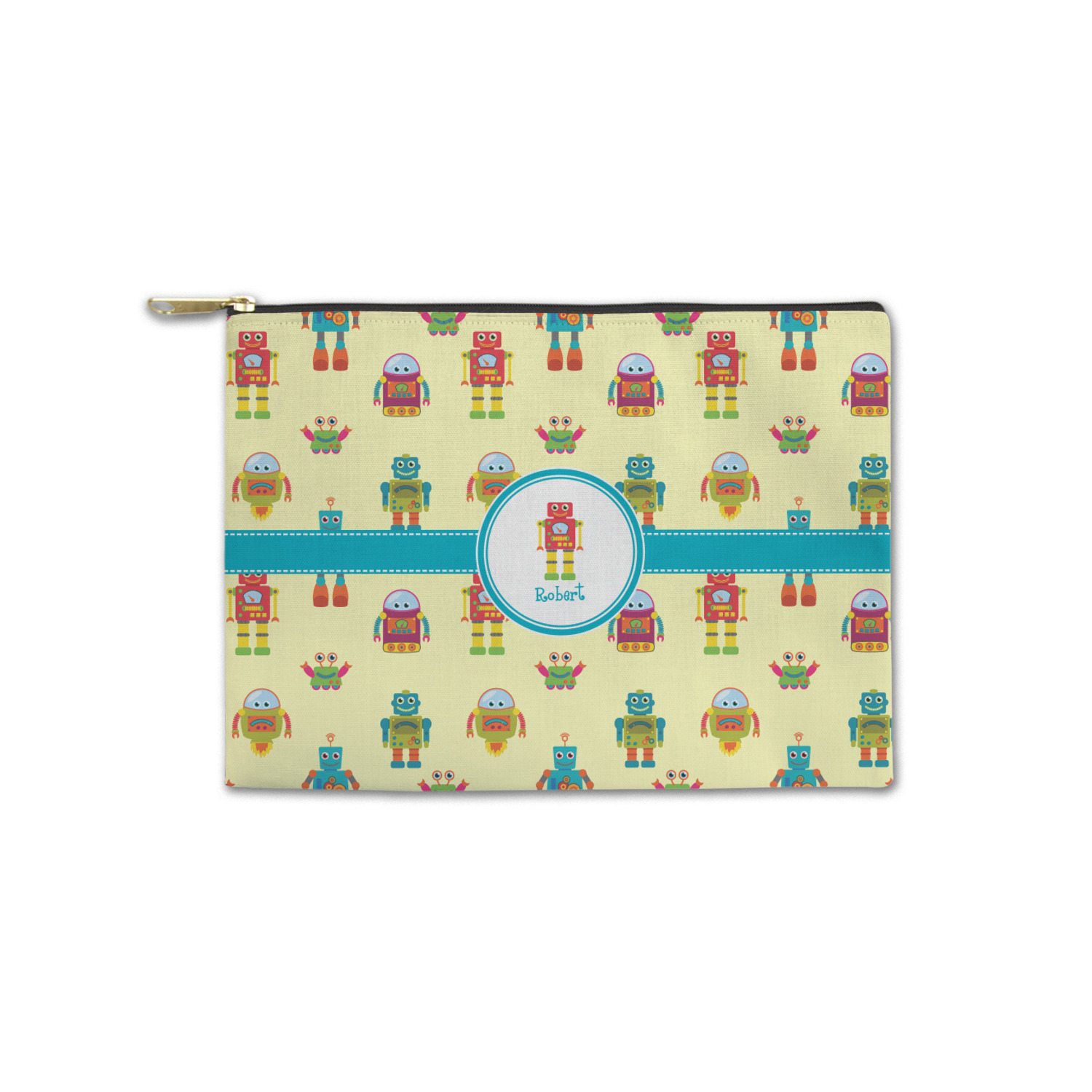 Our zippered pouches are available in two sizes - small: approx 8.5W"x6H and large: approx 12.5Wx8.5H. The pouches are made from a soft & durable canvas fabric that is printed on the outside with your design; the inside has a fused black lining. The printed canvas fabric is then cut and the pouches are sewn right here in the USA. The zipper itself is gold in color and has a round hook.