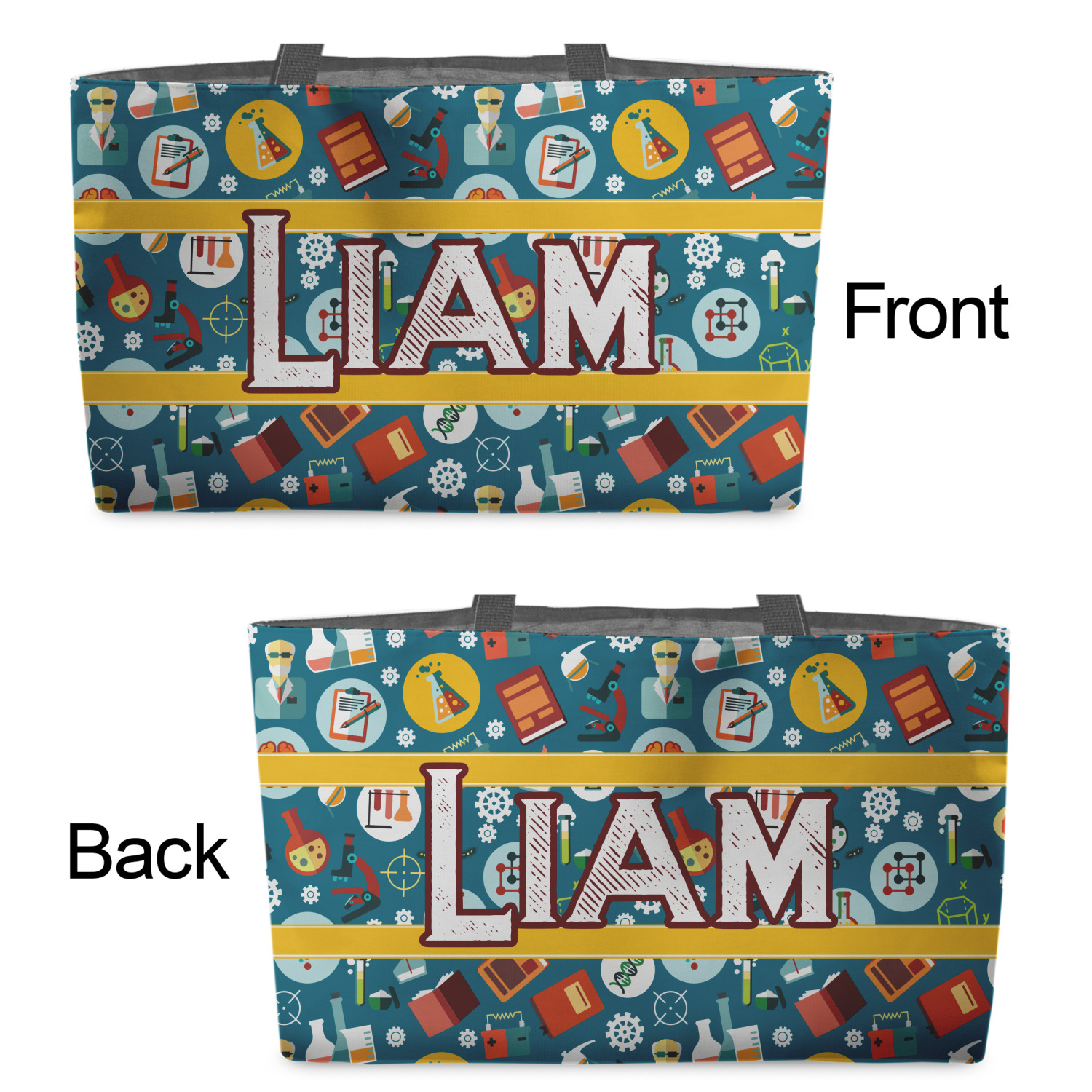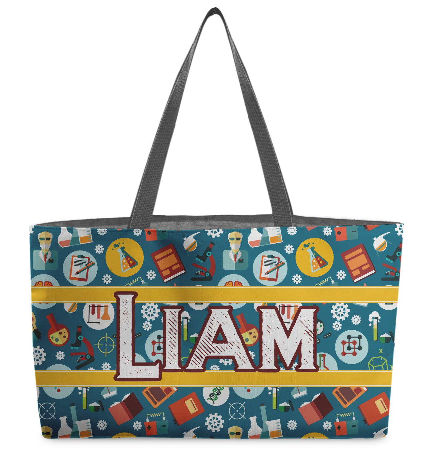 These beach totes are handmade here in the USA. Fabric is printed with your design. The tote is then sewn from the fabric pieces, lining and handles added.