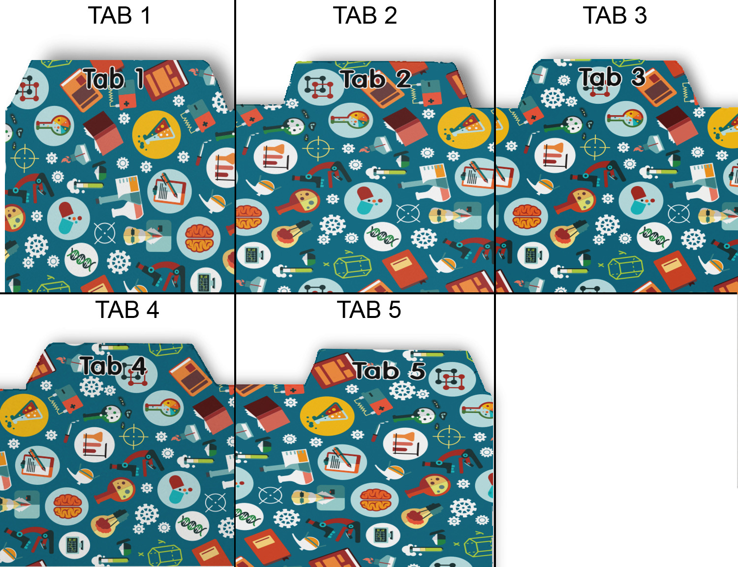 Whether you use binders at school or at work, we have designs to suit all of them. Available in 5 or 6 tab sets, you are sure to find a set to suit your needs. The back of each one is white and can be used to take notes, write vital information on, etc.
