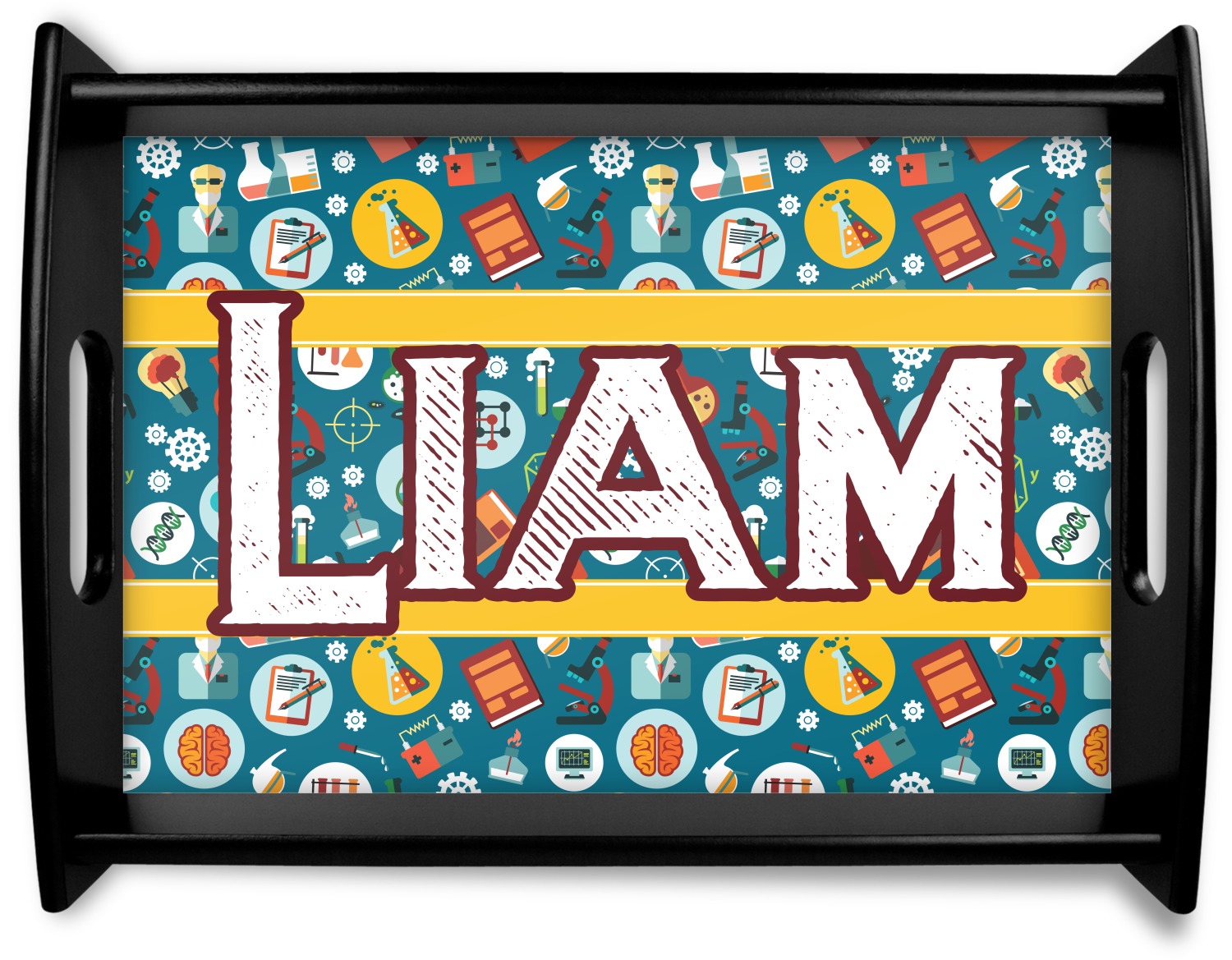 This serving tray with handles features square edges and two rounded sides, creating a very modern look. Each side is fabricated from a beautifully cut, natural wood. The bottom of the interior of the tray displays your customized design in bright, vibrant color. The tray is sold in both a black color and a natural wood look. Each variation of the wood serving tray has two sizes: Small, which is 14" x 10" x 2.25", and Large, which is 19.5" x 13.5" x 2.75".
