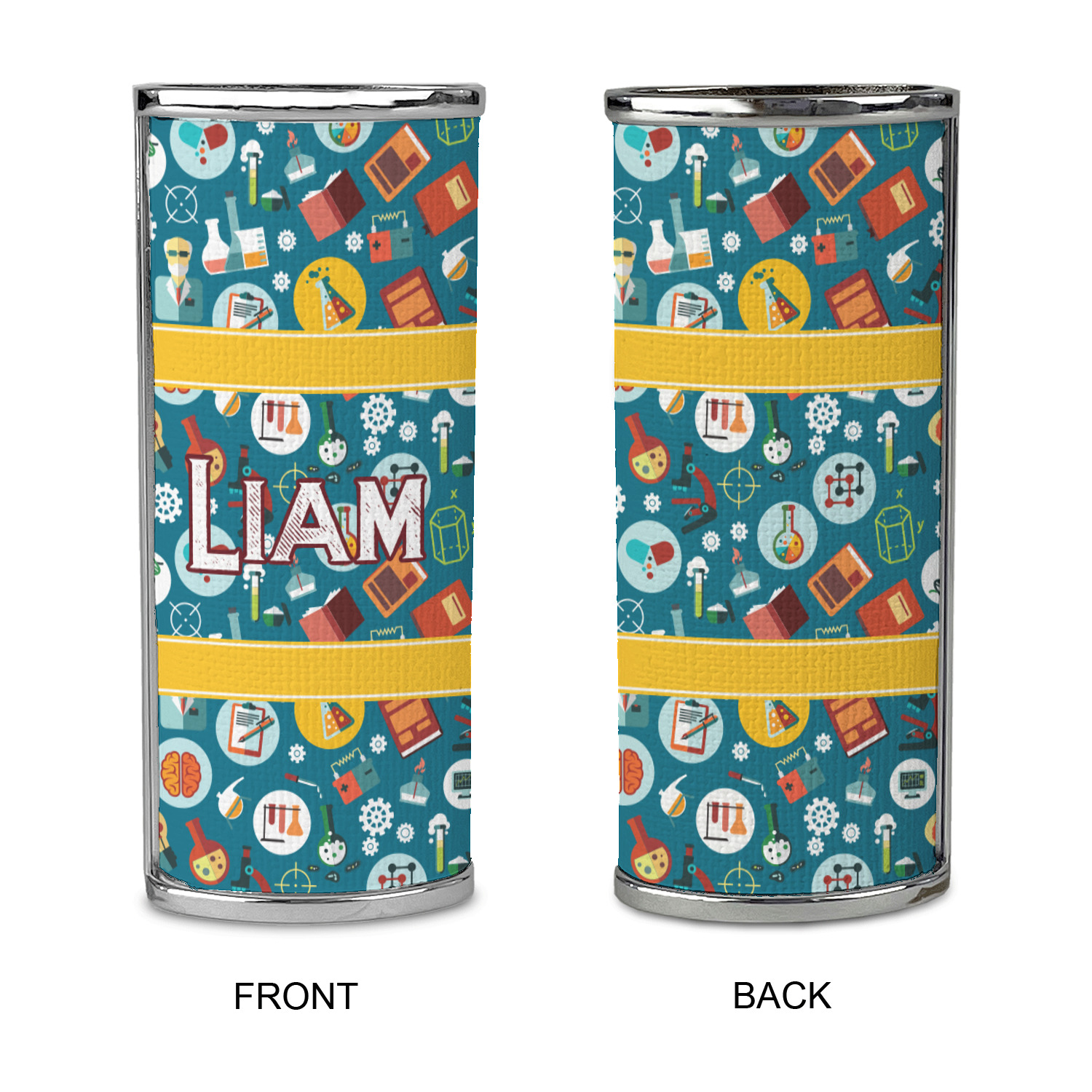 Filled with test tubes, beakers, books, gears, and more, this design is filled with a conglomeration of science graphics. The dark blue background really helps the brightly colored graphics to pop. You will find oranges, yellows, blues, greens and more throughout this design.