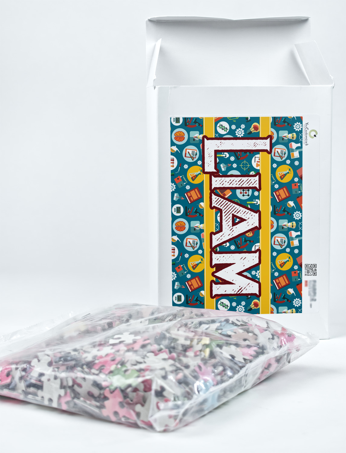 You can also upload your logo or art that you or your kids drew. To create more challenging jigsaw puzzles, you can create a pattern from with your logo or artwork. You can also add other elements such as text or personalization.