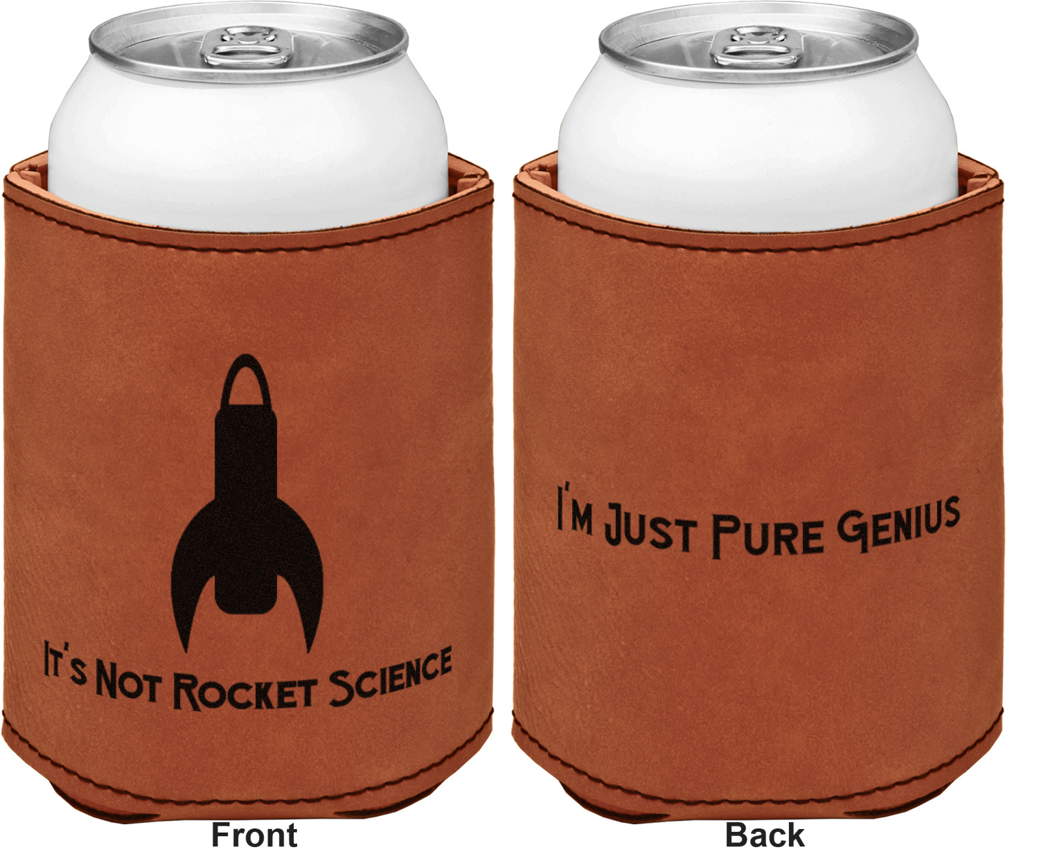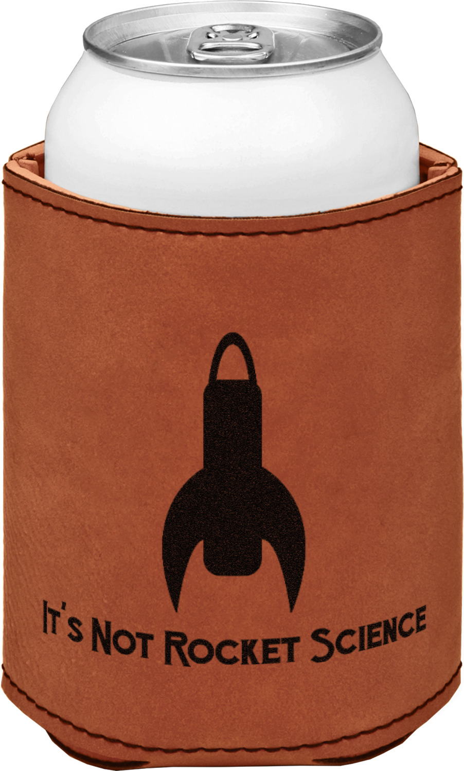 This can sleeve is made from a cognac-brown leatherette and stitched with a sturdy, black thread. A slim padding lines the inside of your can sleeve to allow for a better fit once your drink is inserted. The sleeve itself measures at 4 by 4.5 inches, allowing this custom can sleeve to accommodate most canned drinks. Your personalized design can be engraved on the front and back, or solely the front. When laser-engraved, your design appears as a black coloration which contrasts the leatherette nicely.
