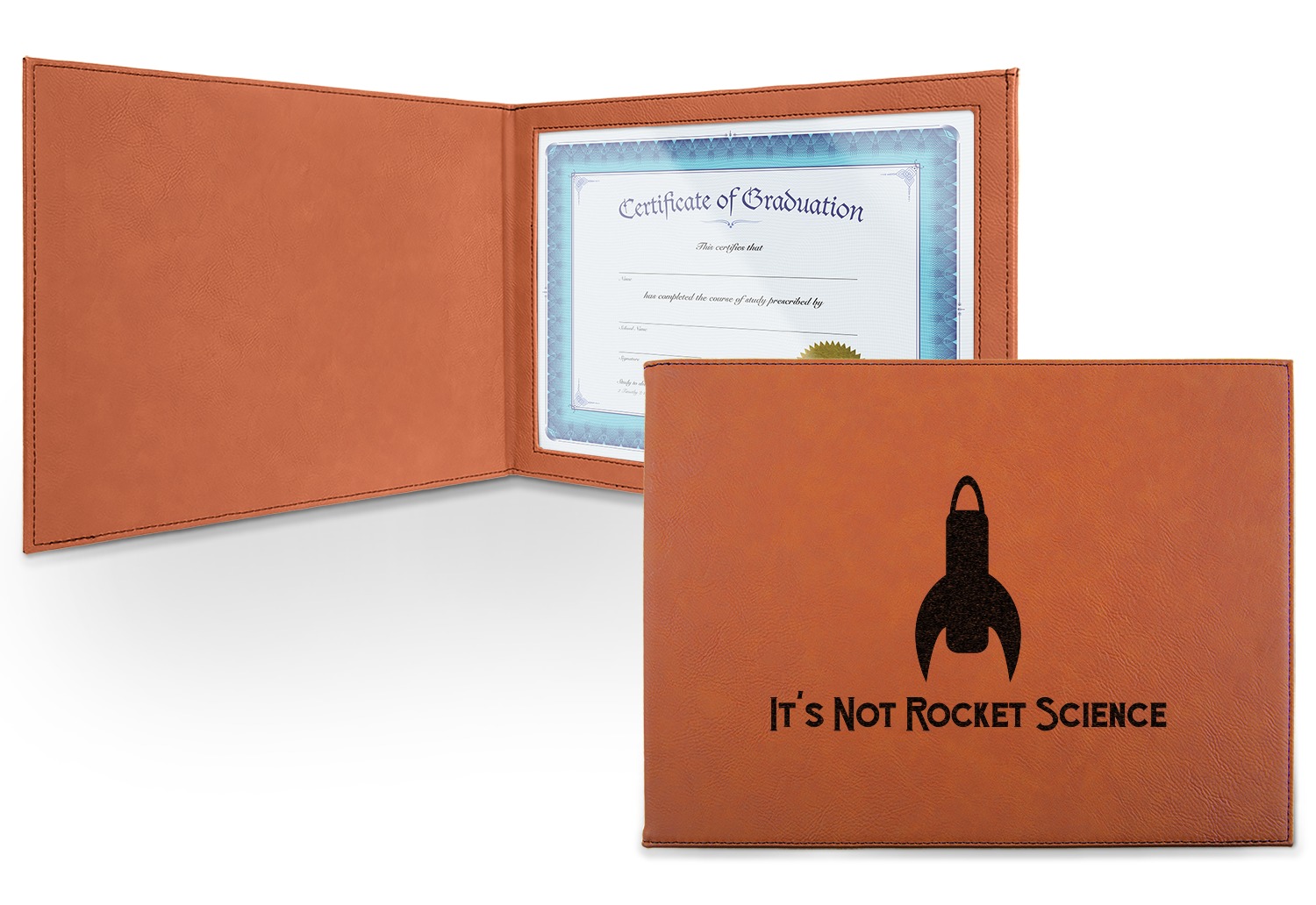 This cognac-colored, leatherette certificate jacket is the ideal way to display or store your hard-earned certificate. When closed, the custom certificate holder measures at 12 by 9 inches. The interior of the certificate cover includes a clear, vinyl window to encase your diploma. The window measures at around 10.5 by 7.5 inches and can accommodate a diploma that measures at up to 8.5 by 11 inches. You can either choose to have your customization laser engraved on the front and interior, or solely the front.