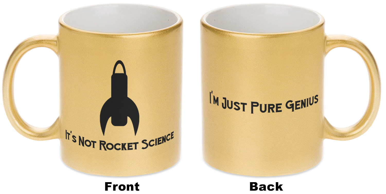 Our custom mugs are ceramic, which is great for keeping your tea or coffee warm! We offer two metallic mugs to personalize - Silver or Gold. Both styles hold around 11oz and have dimensions of approximately 3.75" x 3.5" x 4.75". Both the metallic mugs come in a matte finish and have glitter detailing to add a more pristine feel to the gold and silver base colors.