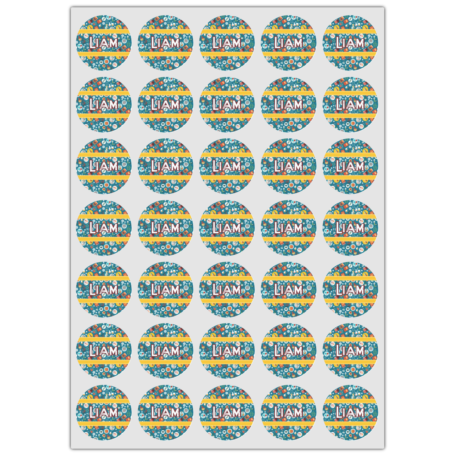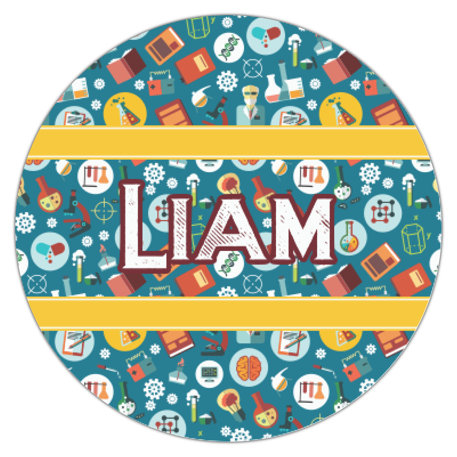 Filled with test tubes, beakers, books, gears, and more, this design is filled with a conglomeration of science graphics. The dark blue background really helps the brightly colored graphics to pop. You will find oranges, yellows, blues, greens and more throughout this design.