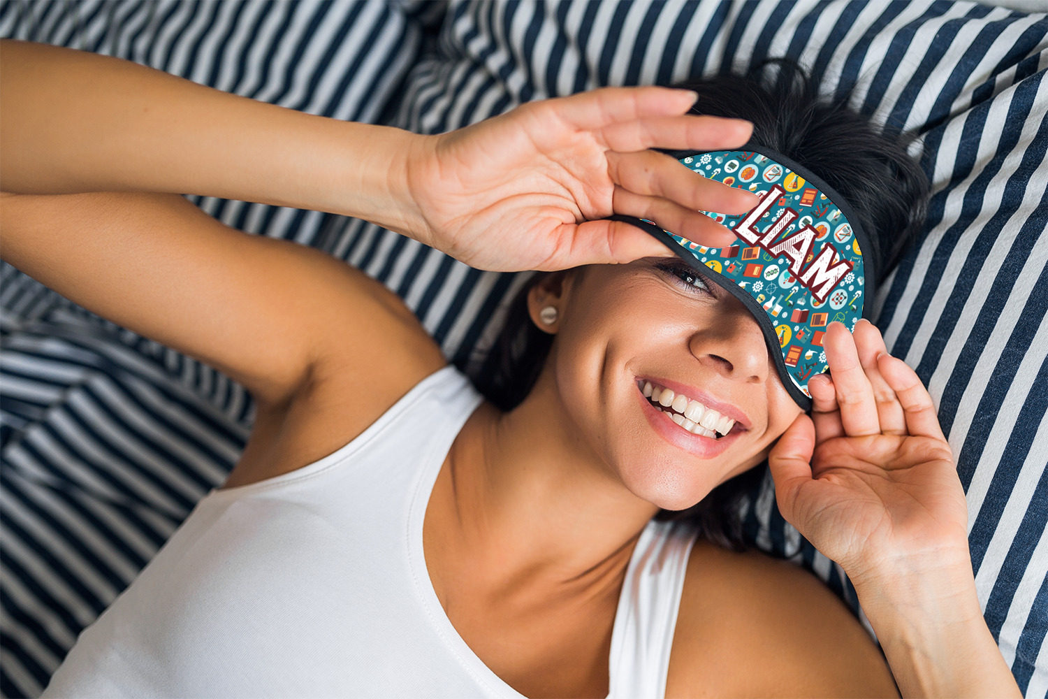 This eye mask has a super soft fleece on the back so that your face will feel snug. The front is personalized by you! There is a black elastic band that goes behind your head. The band is stretchy enough to be a one size fits most. The eye mask comes in 2 sizes: small for regular adult sizes and large for a larger area coverage. The black lining and elastic give it a nice finished look. You will never sleep or nap more comfortably than with this eye mask. These are great for napping when traveling or just at home!