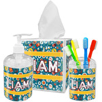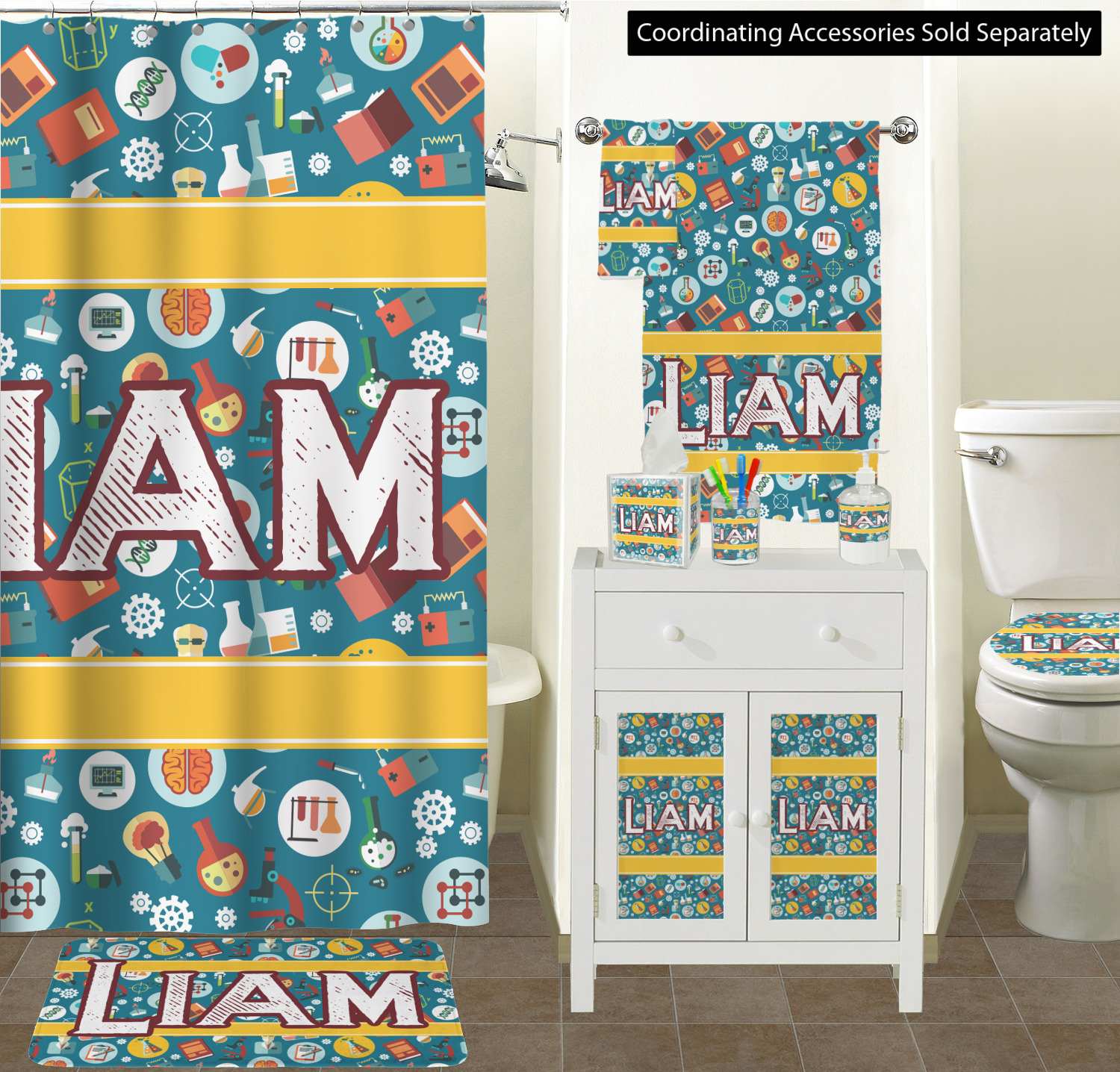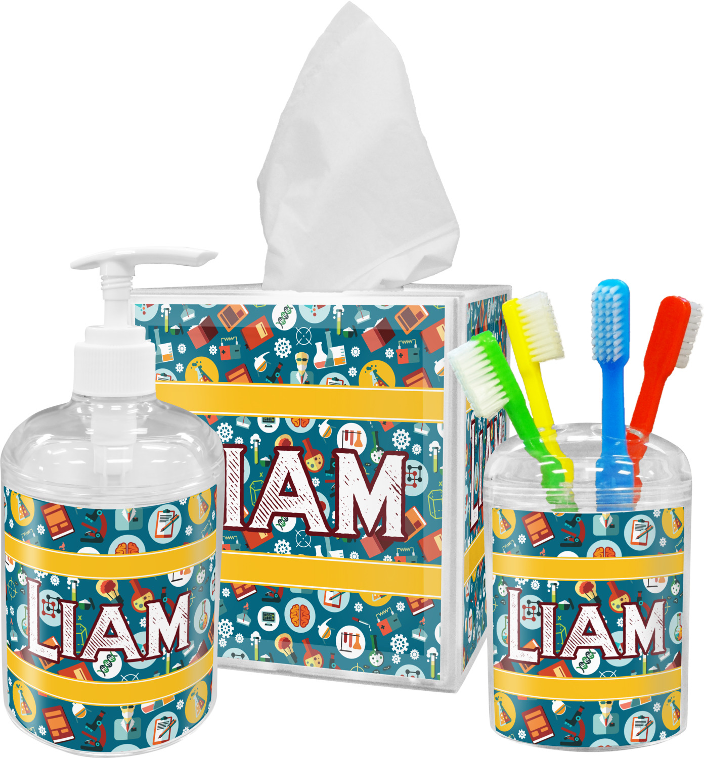 Filled with test tubes, beakers, books, gears, and more, this design is filled with a conglomeration of science graphics. The dark blue background really helps the brightly colored graphics to pop. You will find oranges, yellows, blues, greens and more throughout this design.