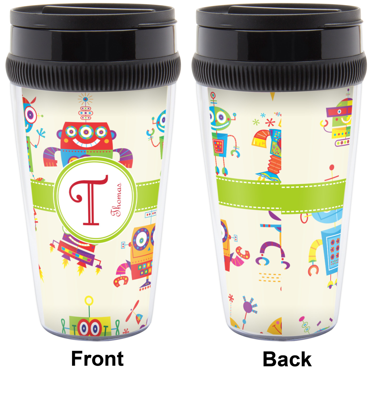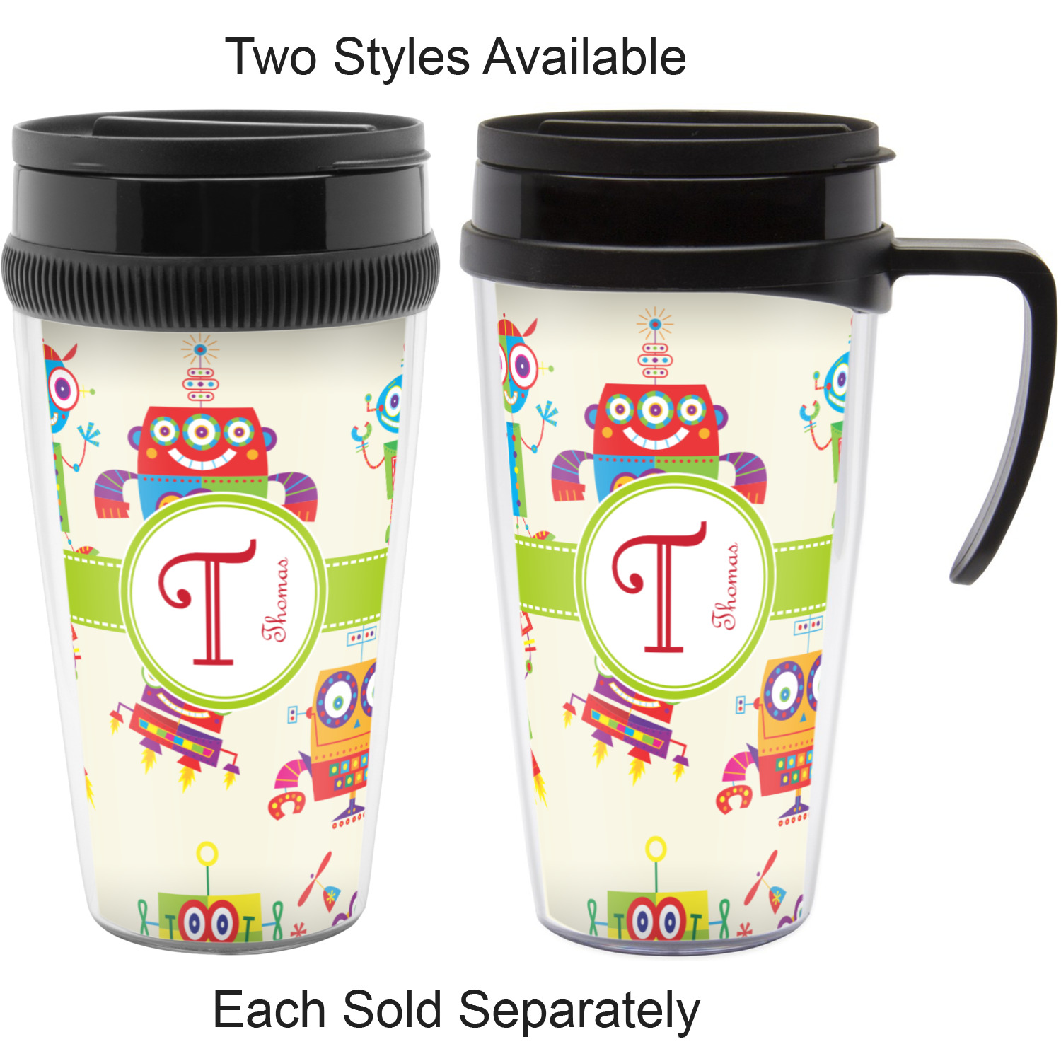 These thermal mugs are free of BPA, and insulated, to keep your drinks hot or cold. The black, snap on lid and the slider for sipping allows you to conveniently sip your drink without constantly worrying about a disastrous spill. We offer this mug with and without a handle, to better suit your needs. Each custom thermal mug holds up to 16 ounces of liquid and displays your customization on all sides on premium gloss media inserts.
