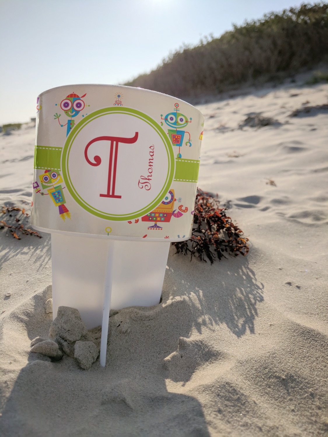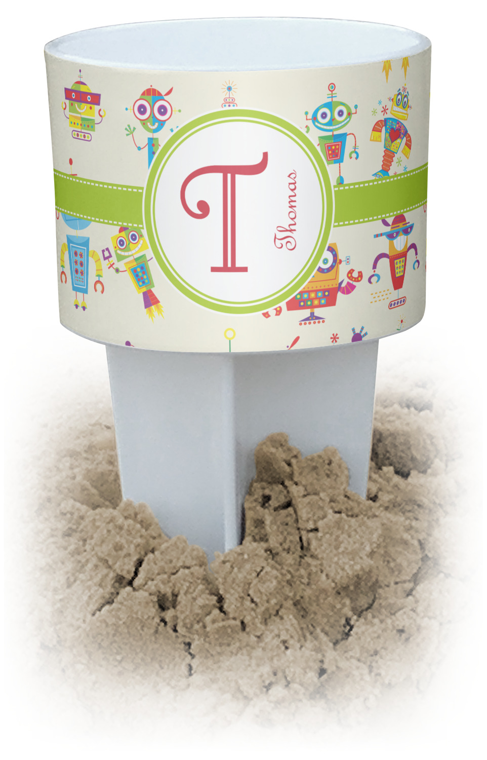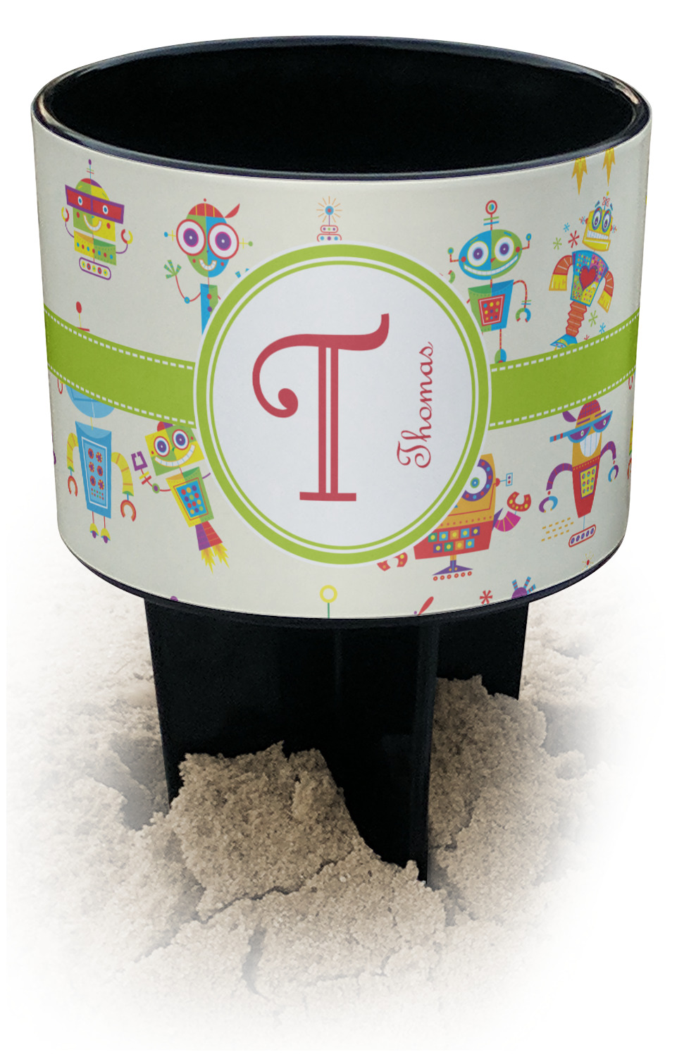 This cup holder has a large stake at its bottom that anchors it to the sand or ground below, while the cup holder rests above the stake. The entire drink holder is made of durable plastic and displays your customization around the cup holder portion. We sell these personalized beach spikers in two different colors: black and white.