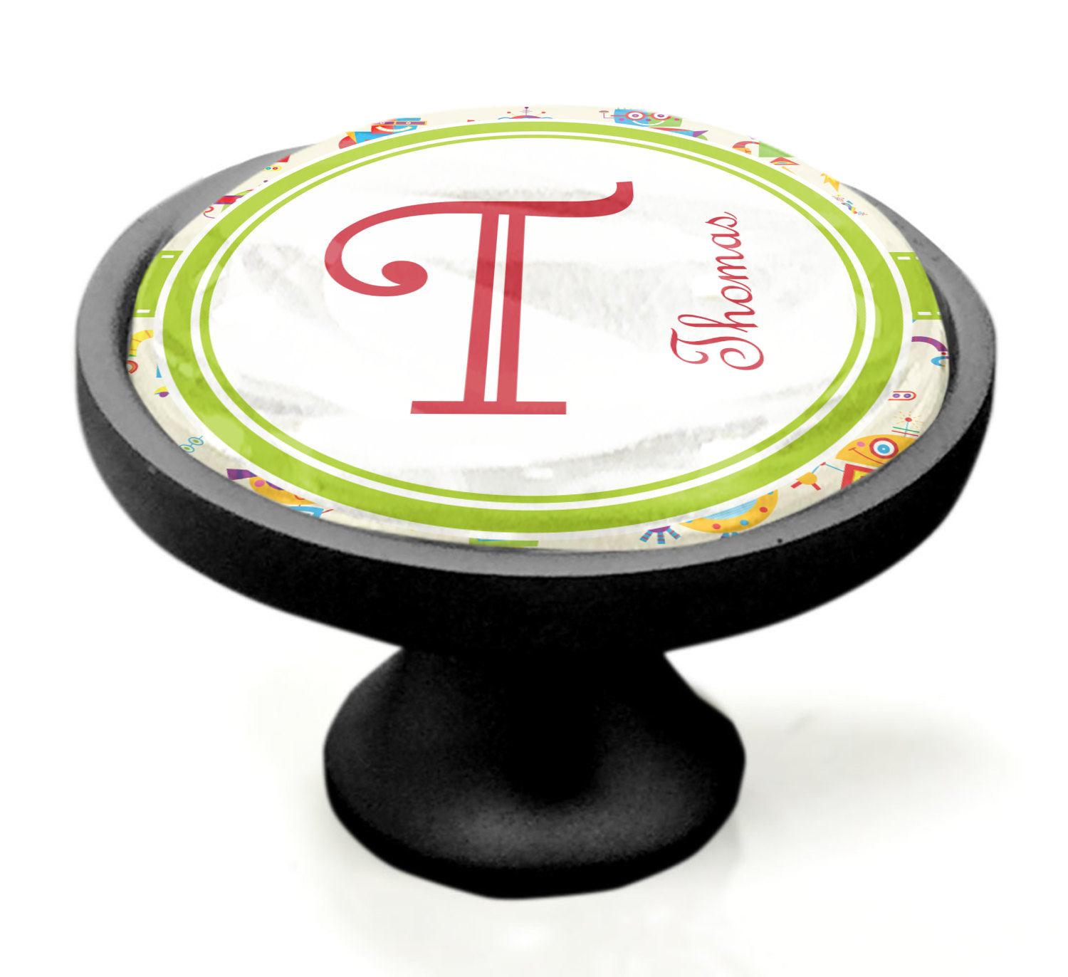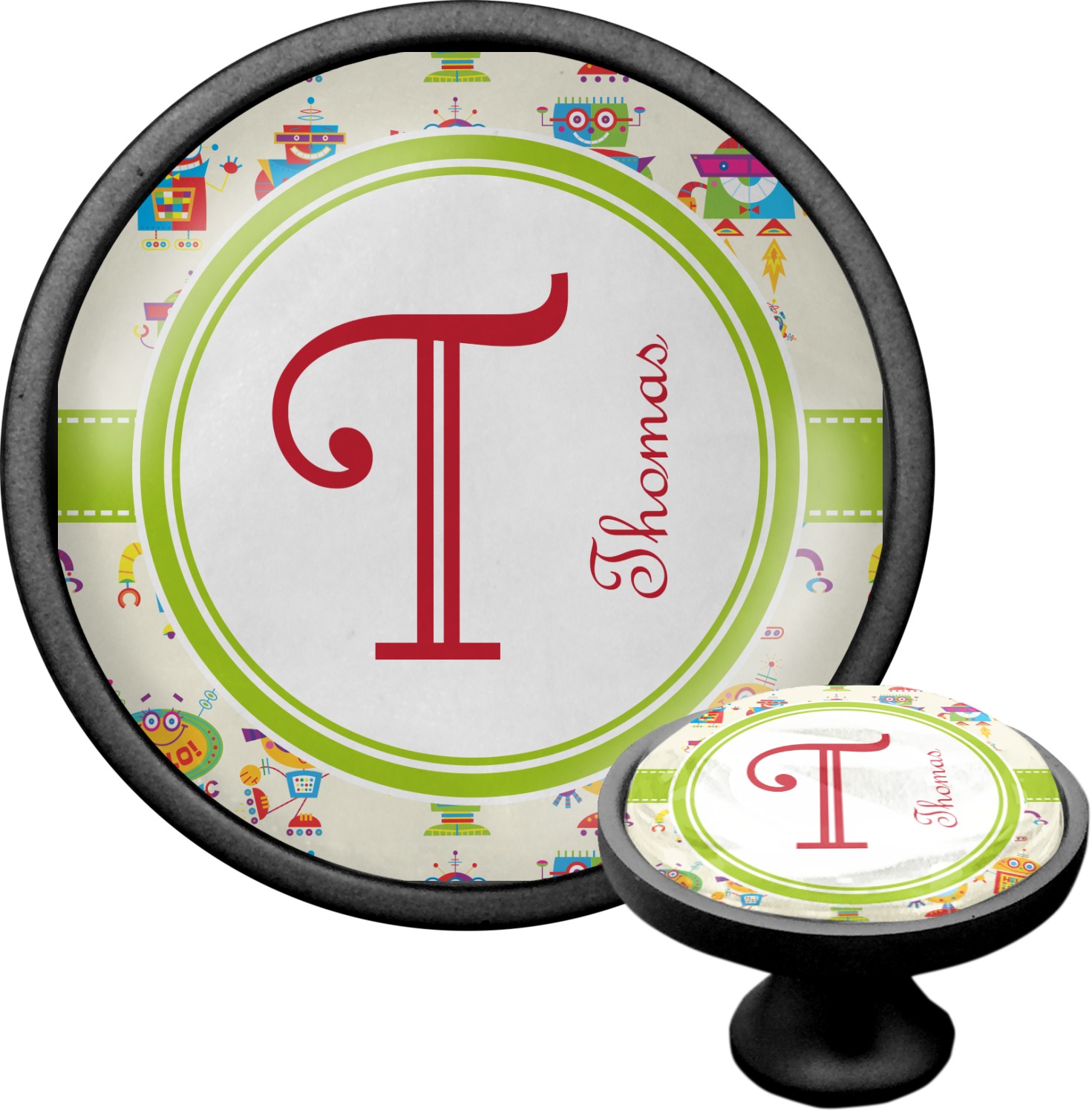 We sell these cabinet pulls in two different colors to better match your room's color scheme. We offer an oil-rubbed bronze base that is black in color, and a satin nickel option, which has a silver color. Your design is displayed across a high gloss vinyl insert that is placed on top of these cabinet handles. We then place a 1 inch thick glass cabochon atop the design, which seals the cabinet knob and makes the colors of your customization stand out. These custom cabinet knobs are approximately 1.3 inches in diameter. Your purchase includes a 1 inch screw that can be used to mount the knob to any cabinet in your home.