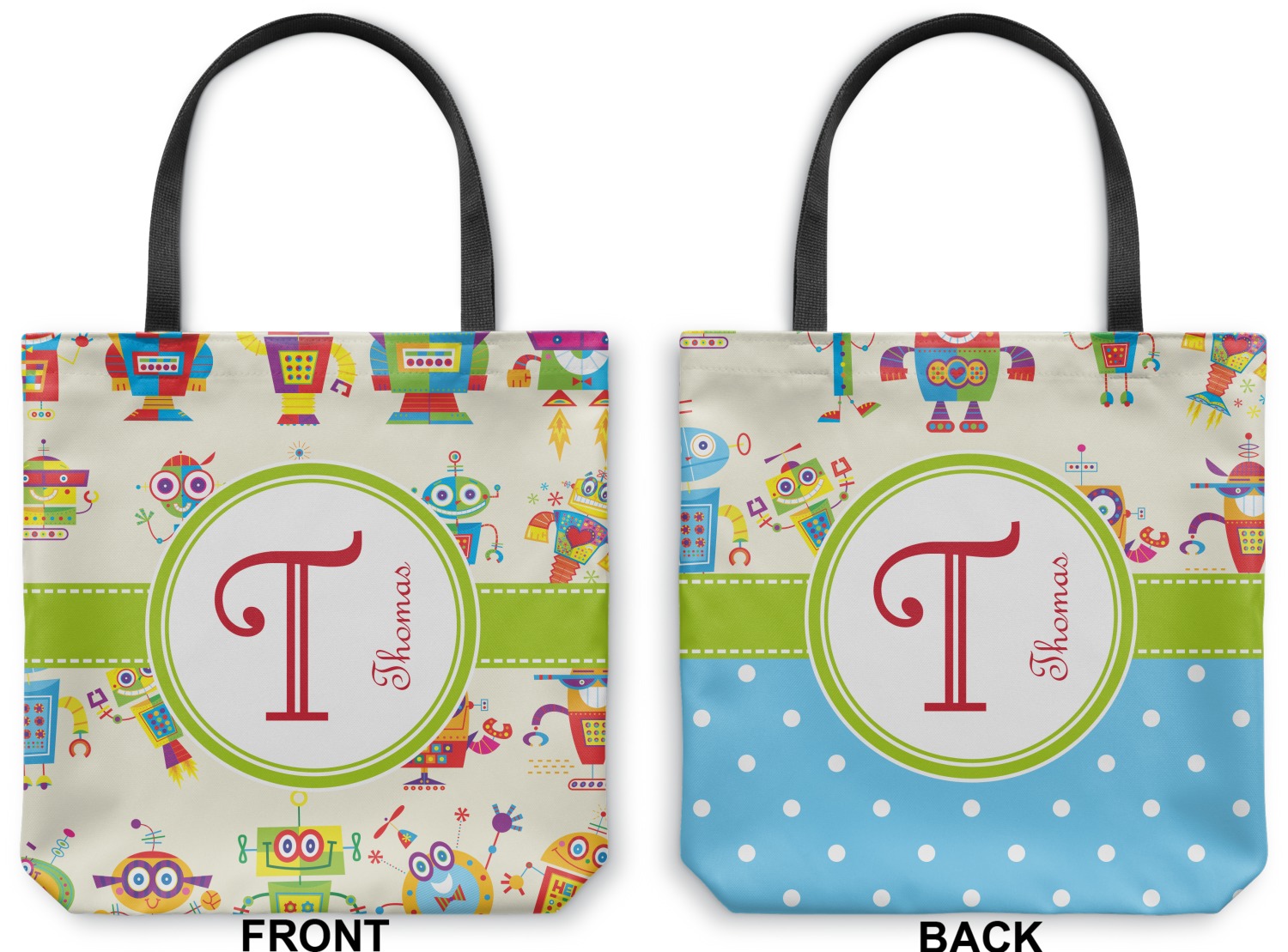 Our totes are made right here in the USA. Your design is printed on canvas fabric; the fabric is then cut and sewn on the sides and on the bottom to add an approximately 3.5 inch gusset. Black cotton handles are sewn in and reinforced. Your tote has a designs on both sides - the designs can be the same or different - the choice is yours. The inside of the tote has a black fused lining.