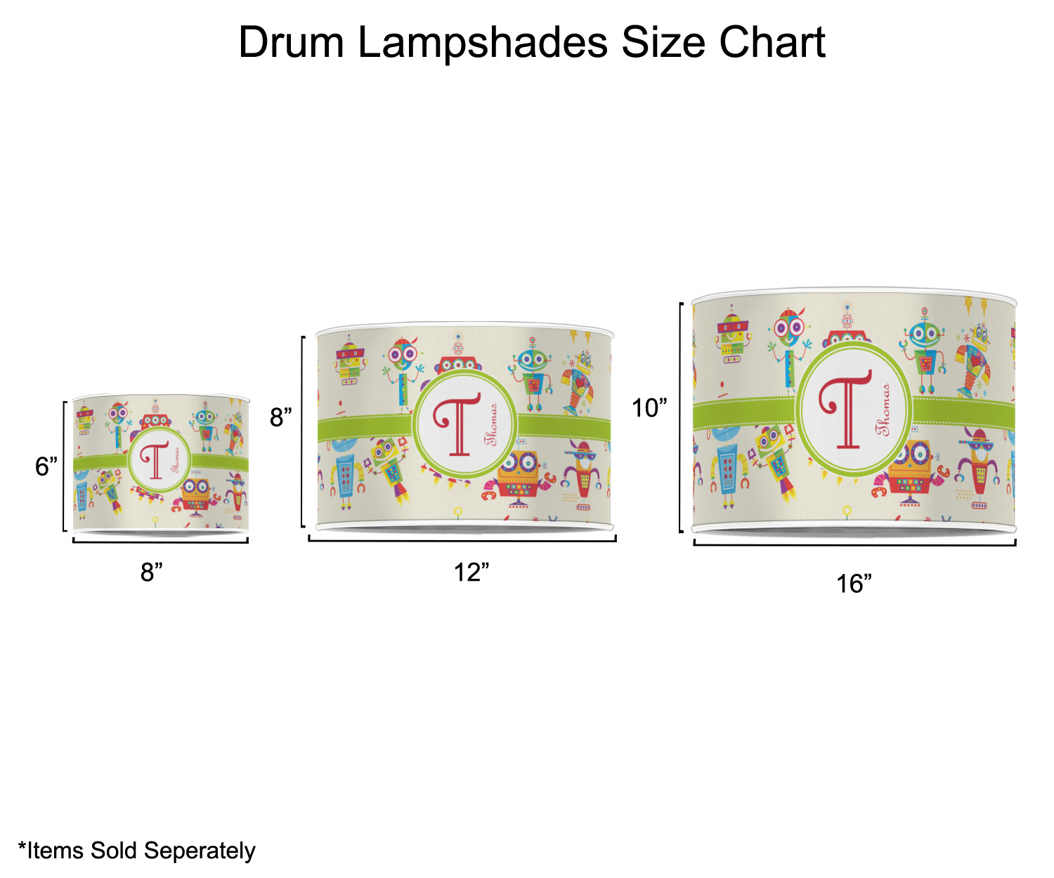 Our customized lamp shades also come in 3 different sizes: 8", 12" and 16", measuring at 8" in diameter by 6" tall, 12" in diameter by 8" tall, and 16" in diameter by 10" tall, respectively.