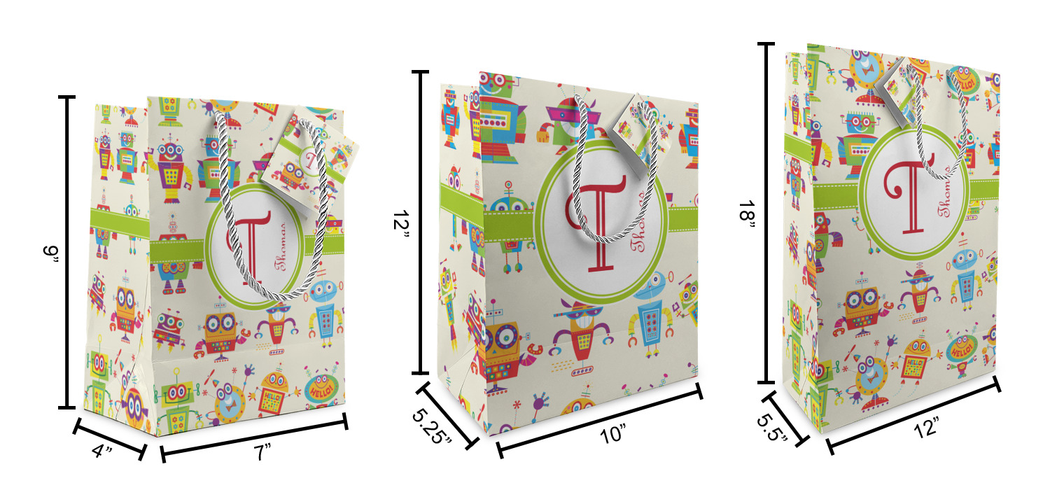 These custom gift bags come in your choice of 3 sizes. Their dimensions are below: