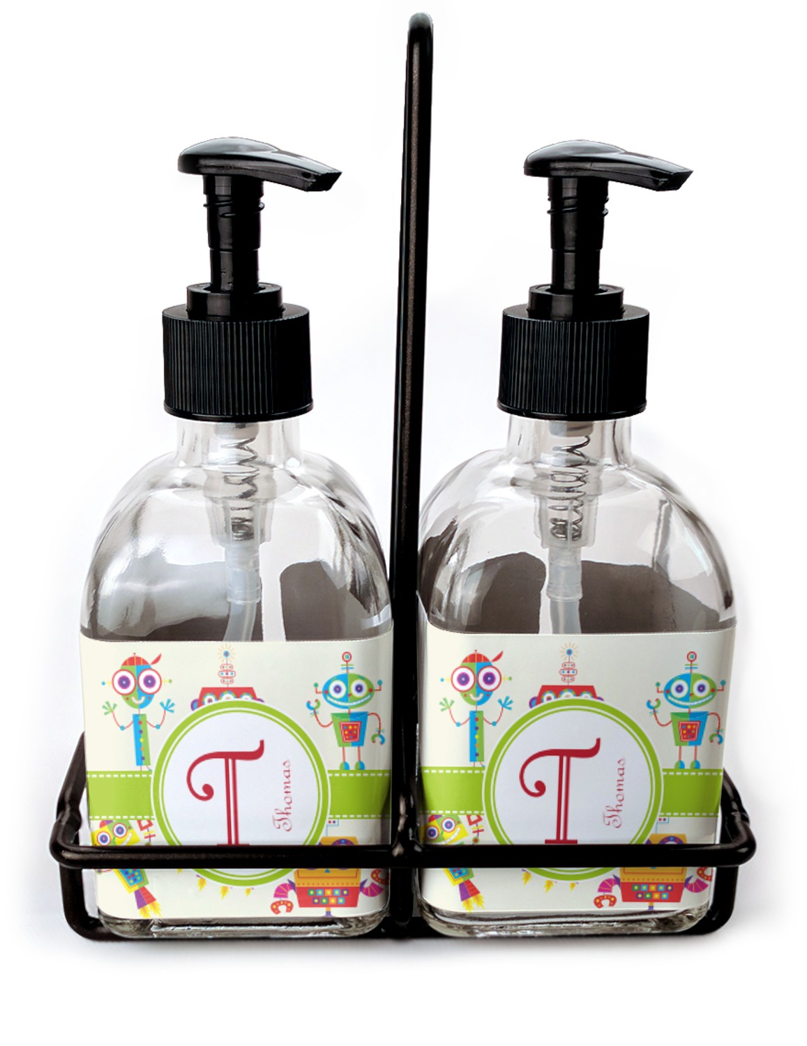 You can purchase these personalized soap dispensers as singulars, or as a set with two bottles. With your purchase of the set, we include a black frame that complements the black color of the pumps and adds to the overall classy look of the piece.