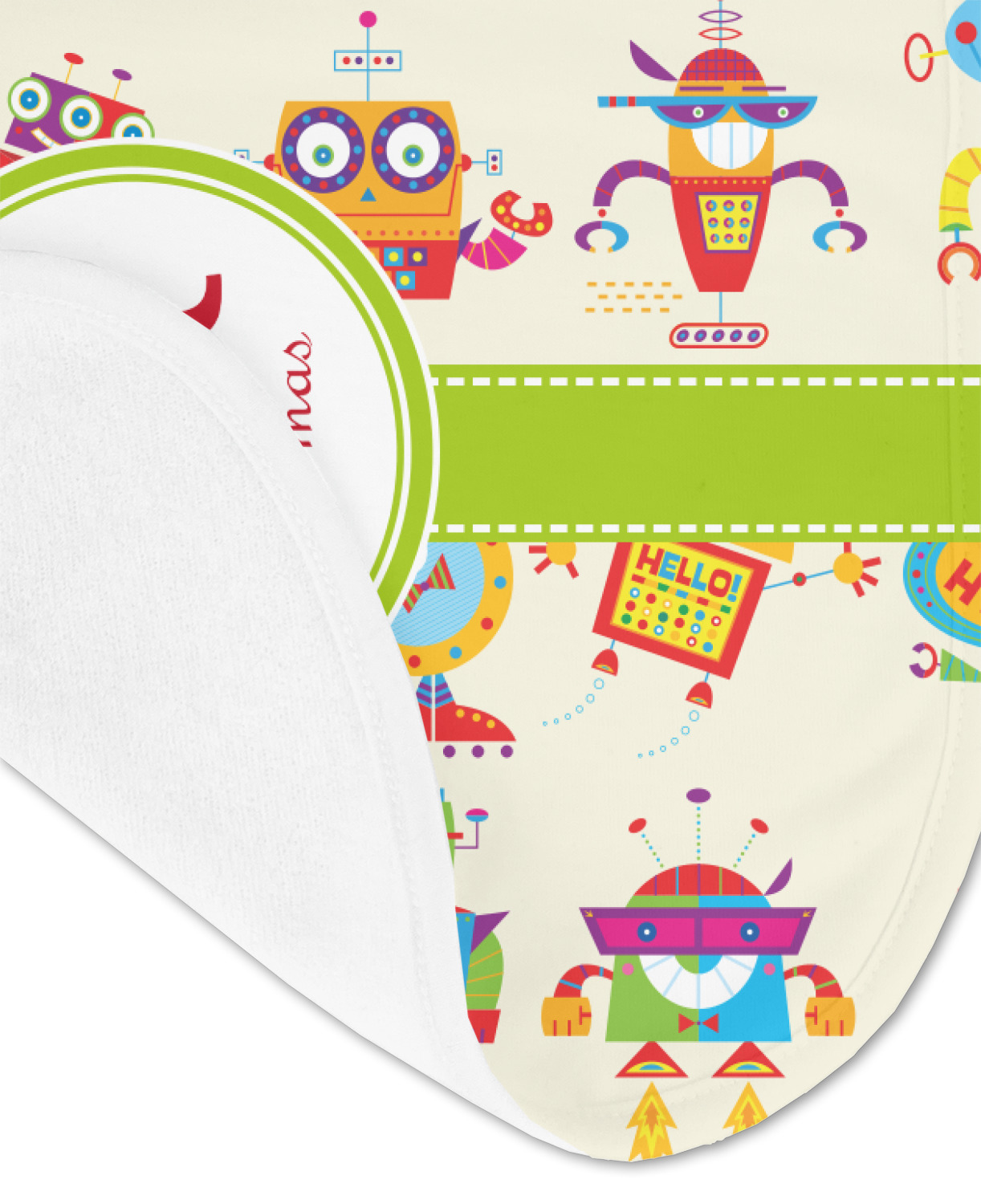 Made of soft polyester, each customizable bib hugs comfortably around the neck to catch every drip and drool. Each bib design is printed with baby-safe ink and finished with a secure stitch pattern and velcro clasp. We carry two customizable bib styles -Microfiber Velour and Jersey Knit.