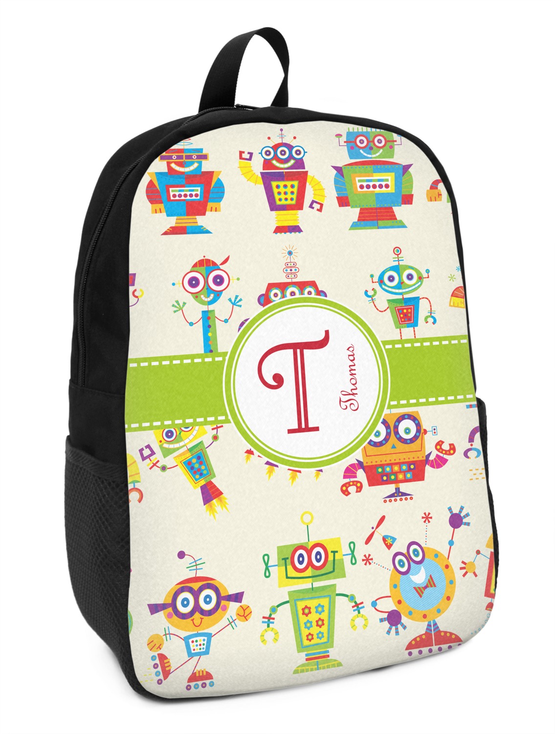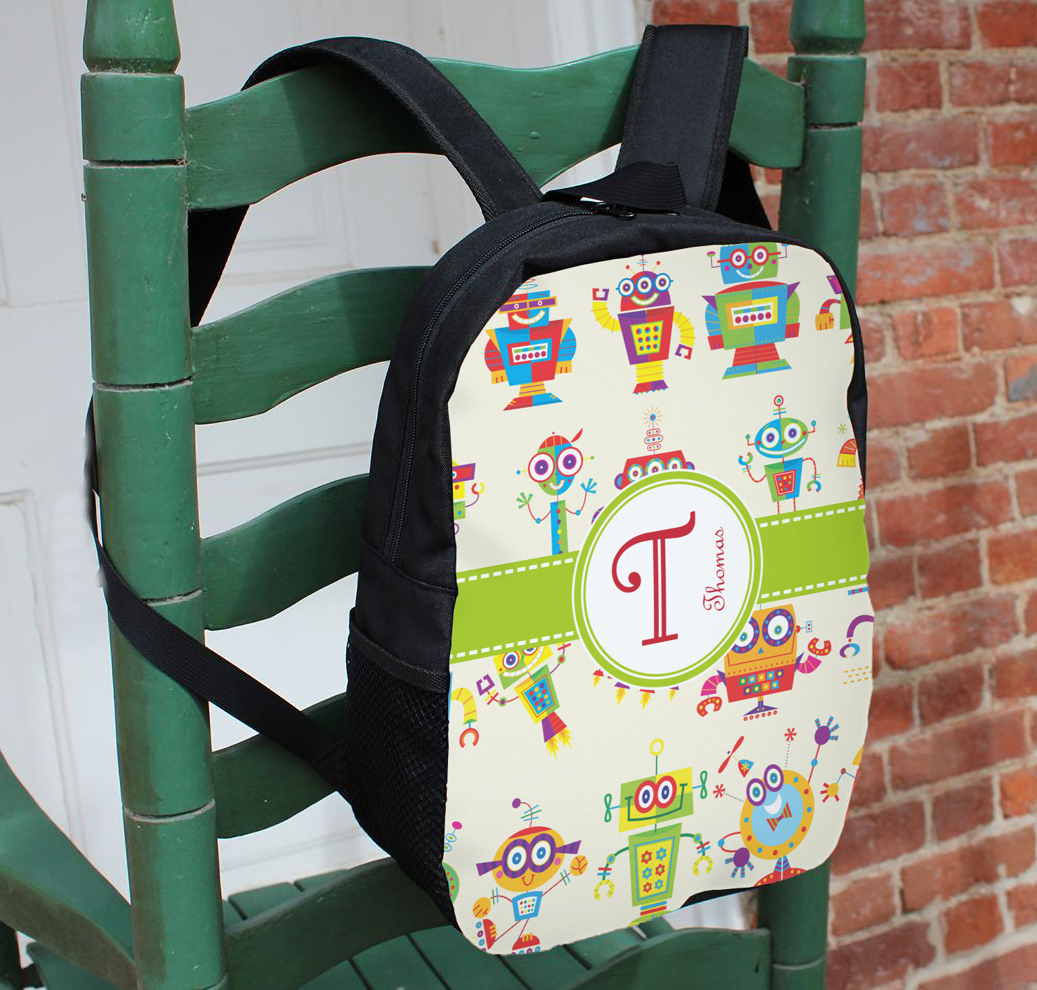 These small backpacks are made of a durable black canvas material with your personalization right on the front. The two shoulder straps are padded and easily adjustable. The bag itself measures at about 11" W x 15" H x 5" D. It's the perfect size for elementary aged kids or adults who want a smaller backpack. On the top of the bag you will find a handle to hang or carry your backpack by as well as a large zipper closure to keep all of your belongings safe inside. On each side of your backpack is a mesh pocket for a small item or water bottle. Inside your backpack you will find a spacious area with a small zipper pocket and a padded laptop slot that will fit up to a 13" laptop (13" being very snug). This is the perfect bag for any student that needs a couple books and their laptop with them at all times. It also works great as a carry on for traveling!