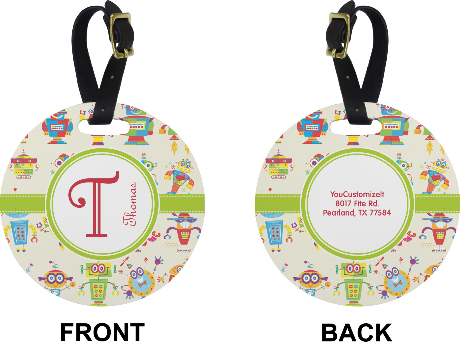 These personalized bag tags are sold in a variety of shapes, so that you may find the product that meets your vision exactly. We sell a round luggage tag, which measures at approximately 4" x 4". Our square luggage tag is about 3.5" x 3.5", while our rectangular version is 2.75" x 4 ".