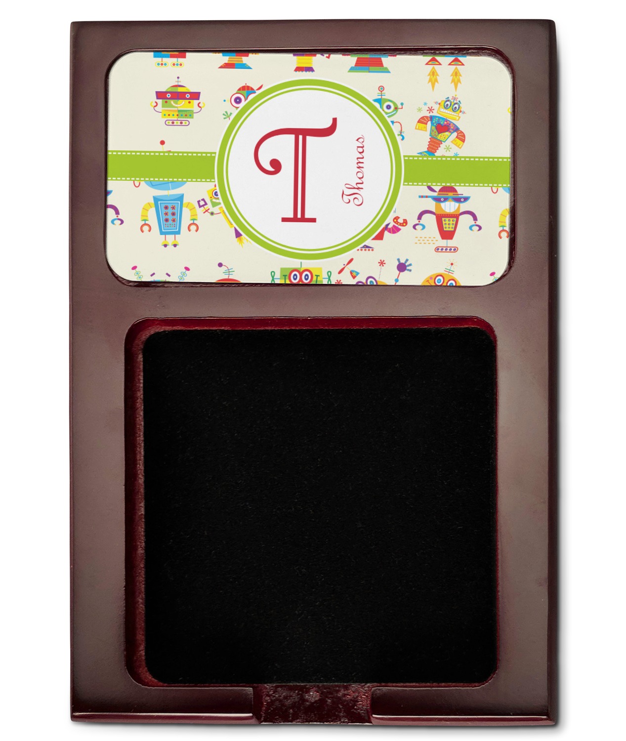 Crafted from a fine mahogany, this post it note holder is in the shade of a dark, cherry color. The dispenser itself is about 4.25 by 6.25 by 0.75 inches. You can place your 3 by 3 inch sticky notes in the indentation below the nameplate. We print your customization onto the nameplate that rests above the velvety indentation.