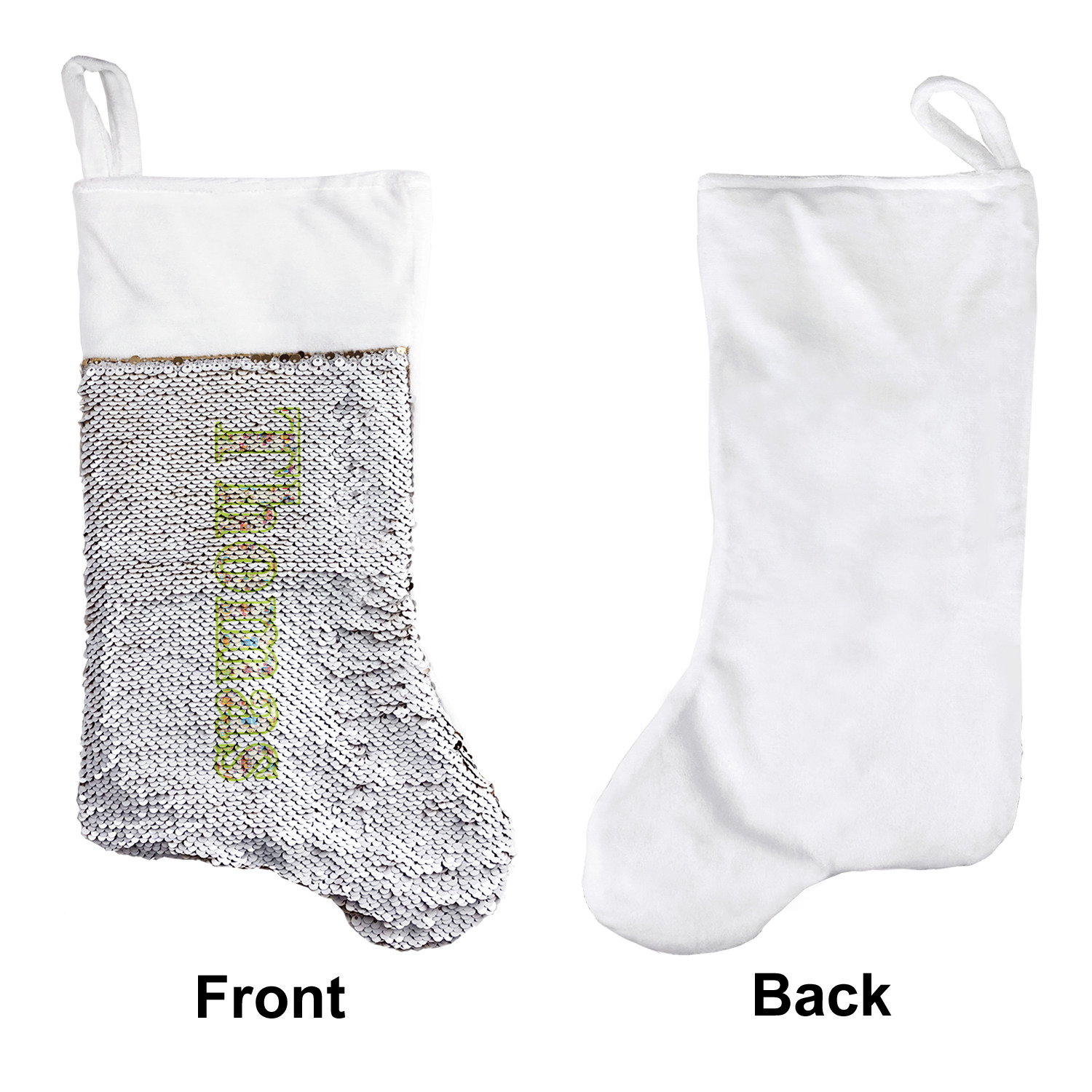 Our fun sequin stockings are made from a soft, yet durable polyester material perfect for any stocking stuffer or holiday decor! Choose from a glamorous gold stocking or classic red sequin stocking for the front color and have your personalized image printed behind for reversible fun! Our sparkly sequin stockings are super fun and decorative perfect for the family and you this holiday! Each stocking is approximately 17" x 9" with a durable loop for hanging and printed here in the US.