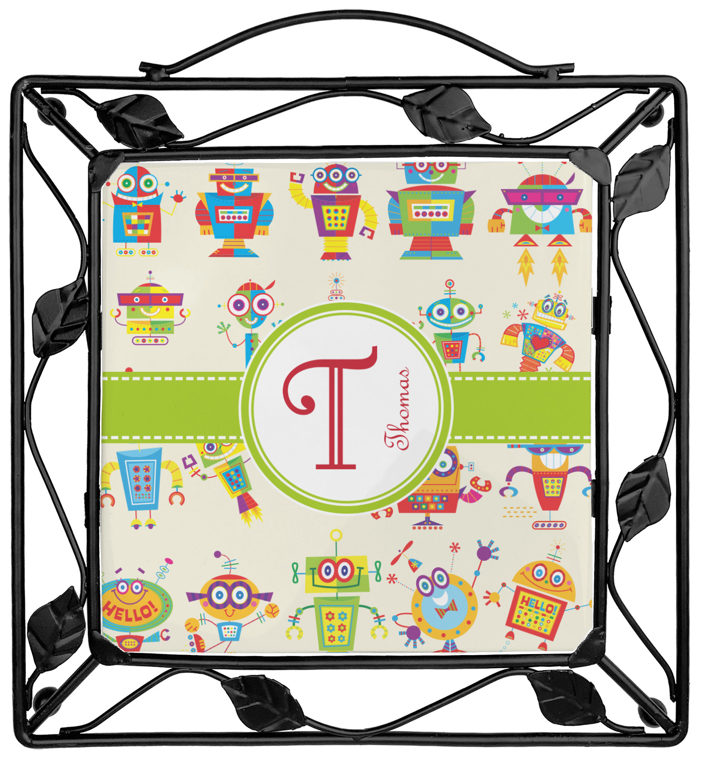 Our square trivets are made from a durable, wrought iron. This model features 4 small half circles, one on each corner, and a larger ring of iron that circles the central, customized tile. Each of the 4 corners has a round foot on its bottom for stability. This trivet is 8.75 by 8.75 inches, but the central tile measures at 6 inches on both sides.