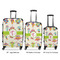 The smallest suitcase is perfect for a carry on (of course, check your airline's dimensions to be sure) while the medium and large suitcases are great as checked bags. The suitcase has 3 different handles. One on the top and the side, each for carrying off the ground. The third is a pop up handle for wheeling your suitcase around on its 4 swivel wheels. Each suitcases size and weight are below: