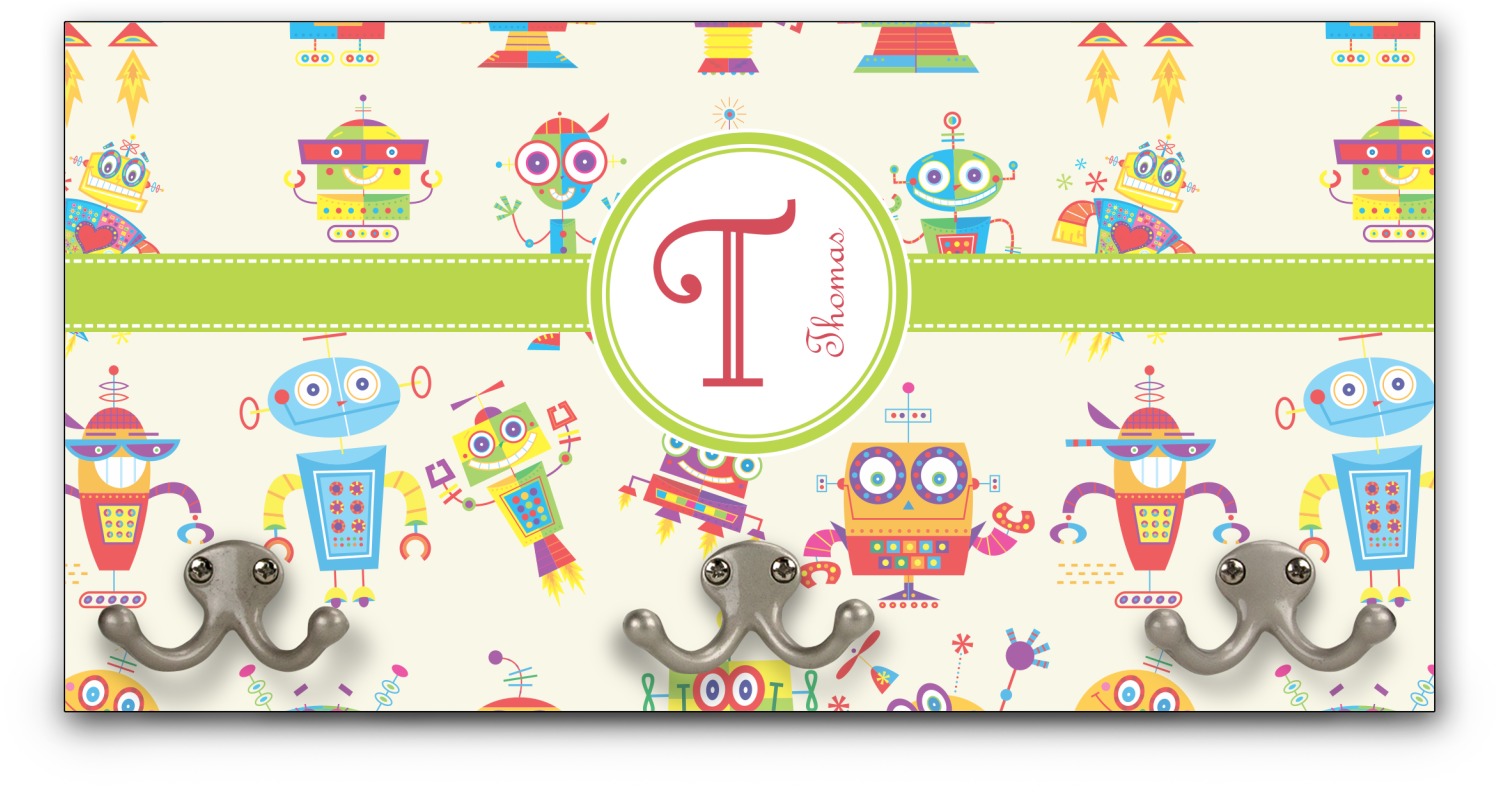 This coat rack is the perfect way to add some personality to your wall or entryway. The board is made of a strong maple that is approximately 16" x 8". The three 2-prong hooks are a sturdy metal that have three screws attaching them to the board. Your design is printed right onto the front of the board while the back and sides are a simple black.