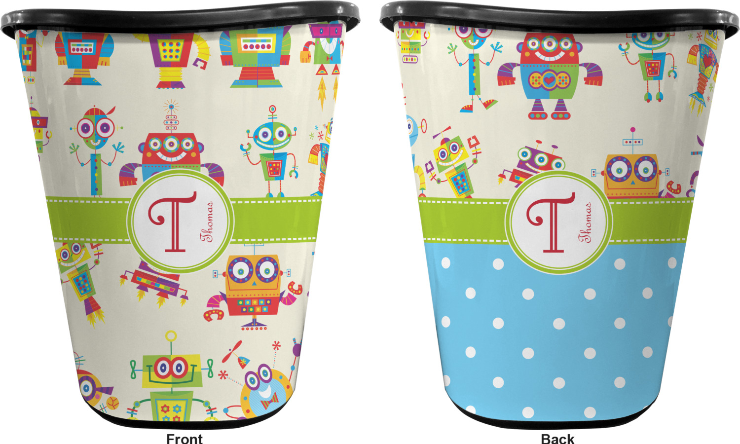 You can choose to purchase these decorative wastebaskets in either a white or a black color that will show on the base and the upper rim. Your customization is printed on a high-gloss, fine-quality vinyl adhesive, and you can choose to either have this adhesive applied to one side only or to both sides. As such, this plastic wastebasket can be single-sided or double-sided, depending on your creative vision. Your customization is printed using durable inks, making the design waterproof and resistant to fading over time.
