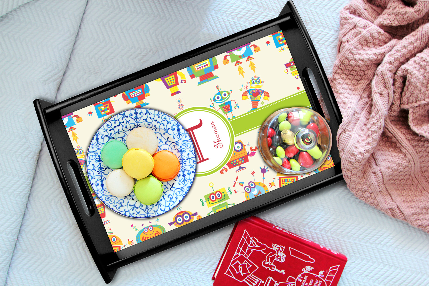 This serving tray with handles features square edges and two rounded sides, creating a very modern look. Each side is fabricated from a beautifully cut, natural wood. The bottom of the interior of the tray displays your customized design in bright, vibrant color. The tray is sold in both a black color and a natural wood look. Each variation of the wood serving tray has two sizes: Small, which is 14" x 10" x 2.25", and Large, which is 19.5" x 13.5" x 2.75".